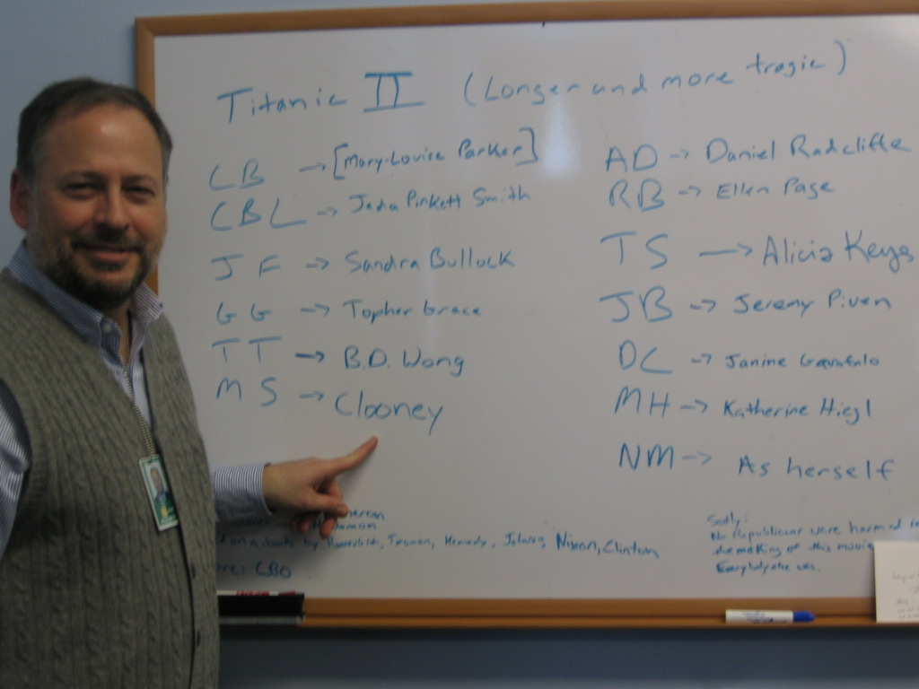 When the passage of the Affordable Care Act looked unlikely in early 2010, the Senate Ways and Means committee took a break from brainstorming how to get the bill through the Senate and pitched a movie based on their perceived failure. They named their fictional film Titanic II (Longer and more tragic), and chose celebrity actors to play each of them. In this photograph, 2009-10 fellow Mark Schwartz points to who would play him in the fictional film.