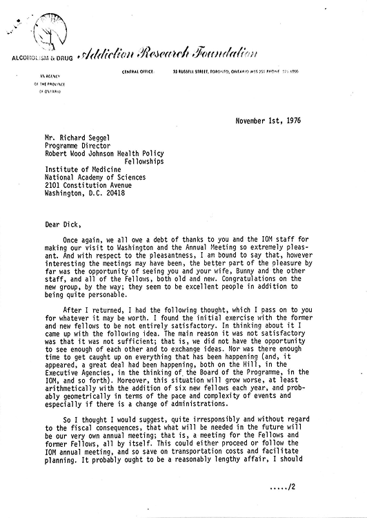 “After I returned, I had the following thought, which I pass on to you for whatever it may be worth. I found the initial exercise with the former and new fellows to be not entirely satisfactory. In thinking about it, I came up with the following idea. The main reason it was not satisfactory was that it was not sufficient; that is, we did not have the opportunity to see enough of each other and to exchange ideas. Nor was there enough time to get caught upon everything that has been happening (and, it appeared, a great deal had been happening, both on the Hill, in the Executive Agencies, in the thinking of the Board of the Programme, in the IOM, and so forth). Moreover, this situation will grow worse, at least arithmetically with the addition of six new fellows each year, and probably geometrically in terms of the pace and complexity of events and especially if there is a change of administrations. So I thought I would suggest, quite irresponsibly and without regard to the fiscal consequences, that what will be needed in the future will be our very own annual meeting; that is, a meeting for the Fellows and former Fellows, all by itself….You will see, I think, that there would be ample material for an agenda. I also think it wouldbe great fun, and quite rewarding for all concerned. Finally, I think it would tend to provide cohesion for the group and to sharpen its direction in terms of putting what was learned during the Fellowship year to good and continuing effect….Well, see what you think. I would greatly enjoy such a function.”