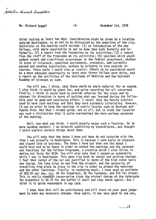 Early meetings were tacked onto the Institute of Medicine’s annual meeting and the agenda was similar to a board meeting – they reviewed the current state of the program and collected feedback for program evaluation. After attending the 1976 meeting, Dr. Frederick B. Glaser (1975-76 fellow) wrote to Program Director Richard L. Seggel with his suggestions for future meetings: