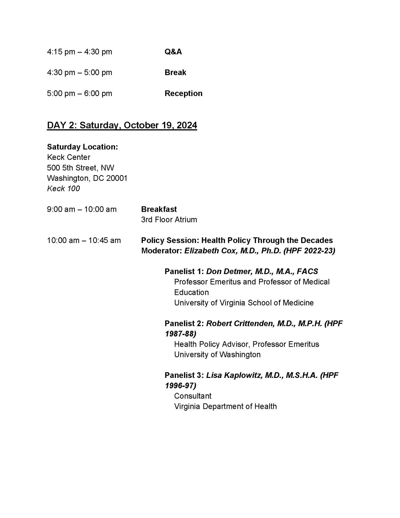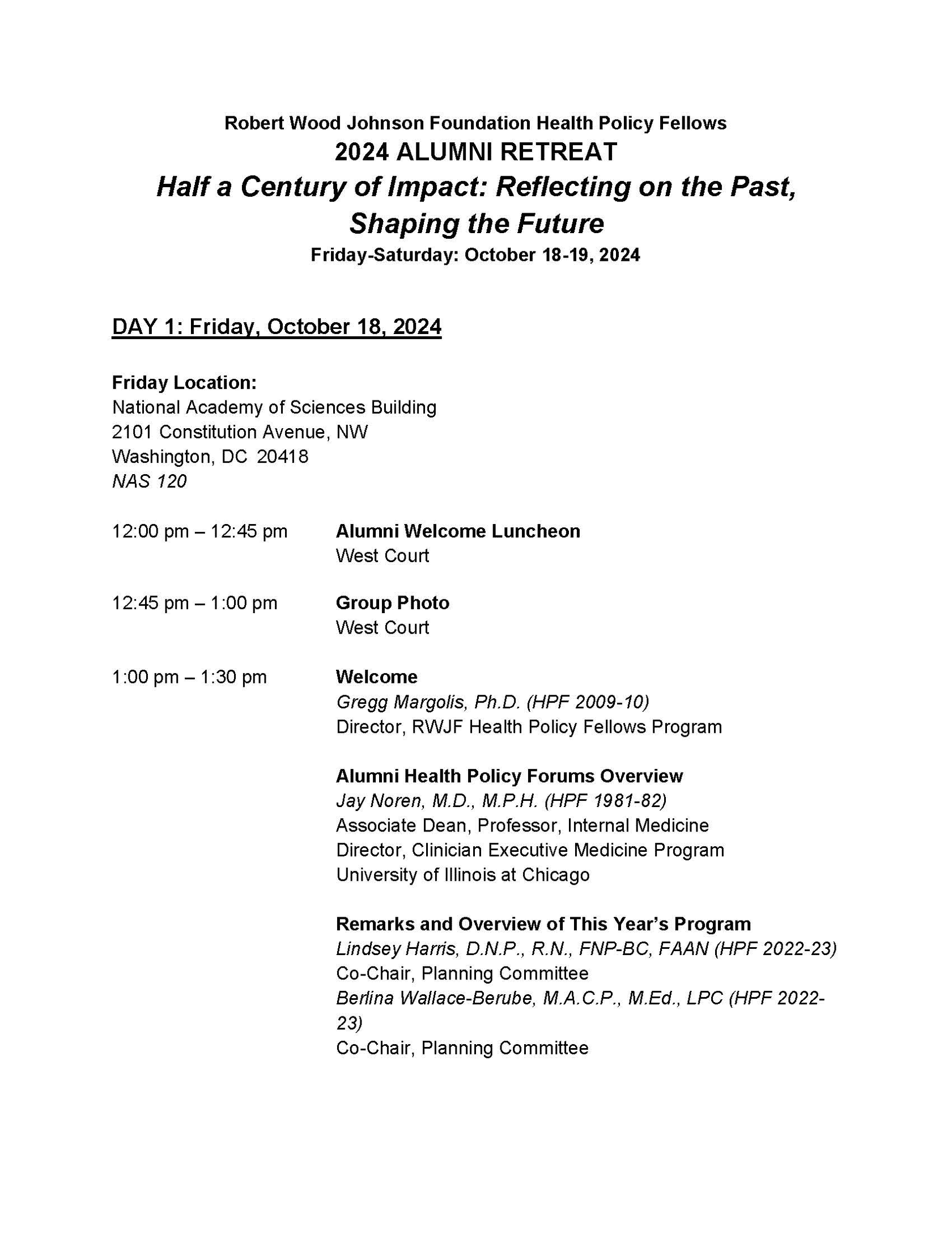 The 50th Annual Alumni Retreat was held on October 18-19, 2024. The theme for the event was “Half a Century of Impact: Reflecting on the Past, Shaping the Future.” More than 100 alumni met to hear perspectives on leadership, learn how health policy has changed over the past 50 years, and discuss the future of health policy.