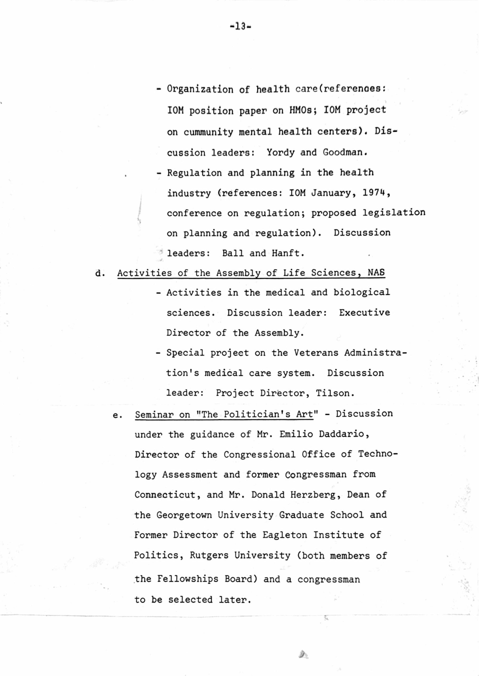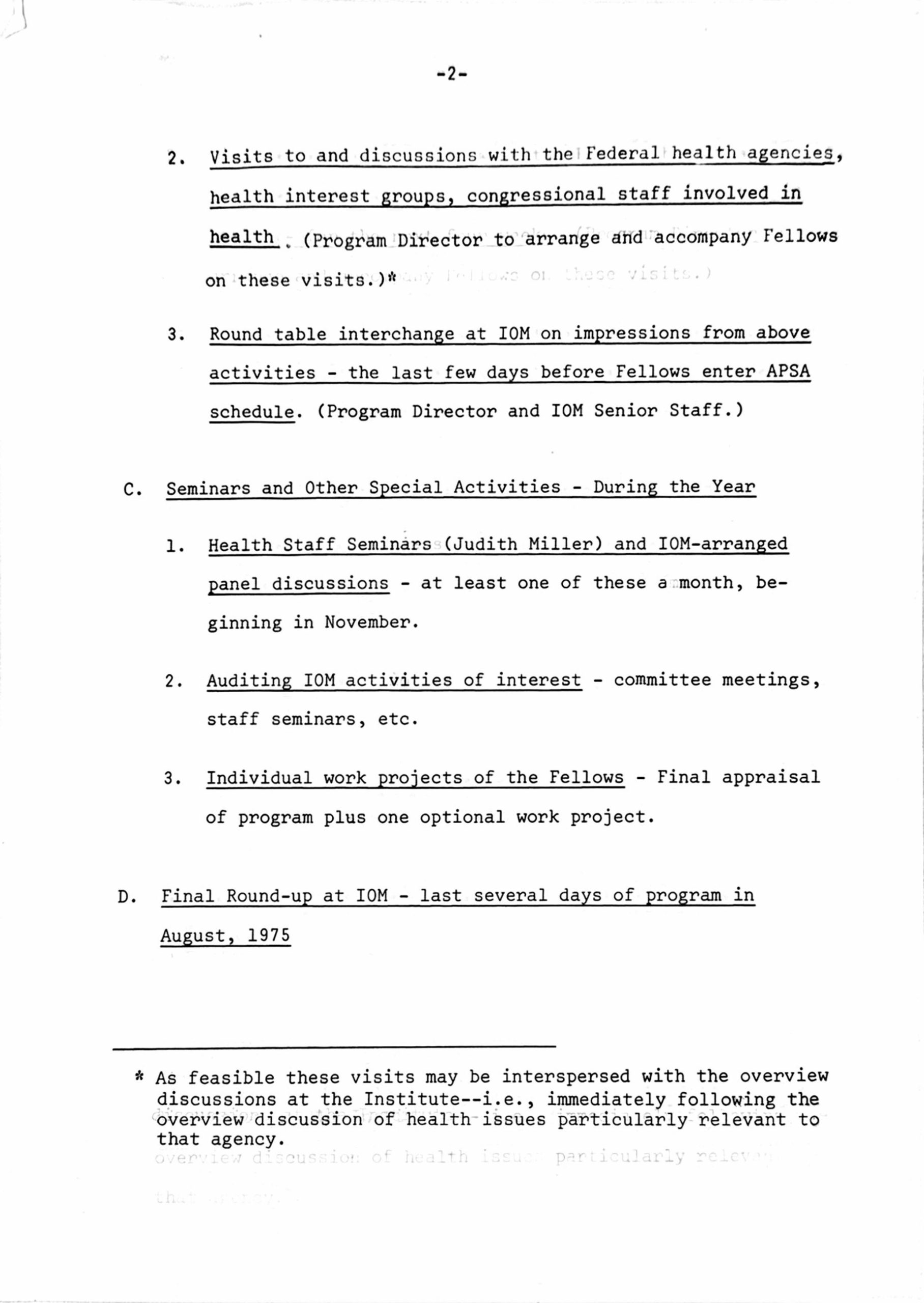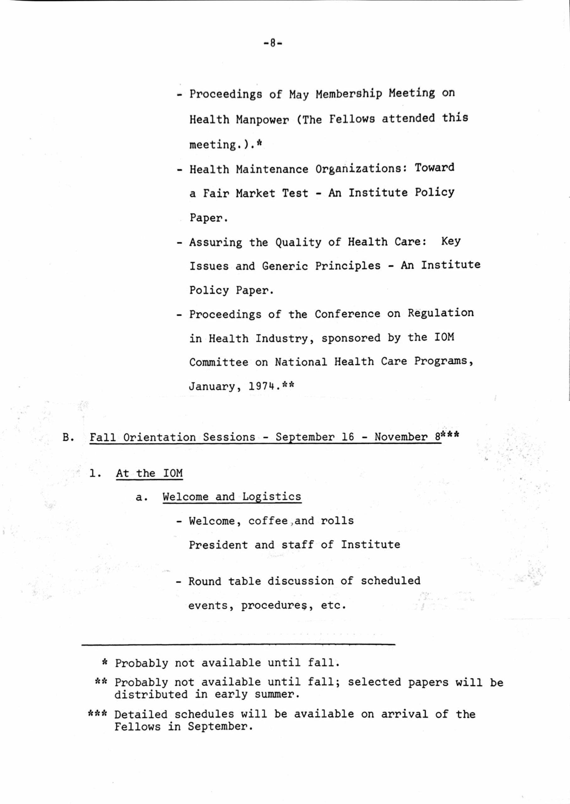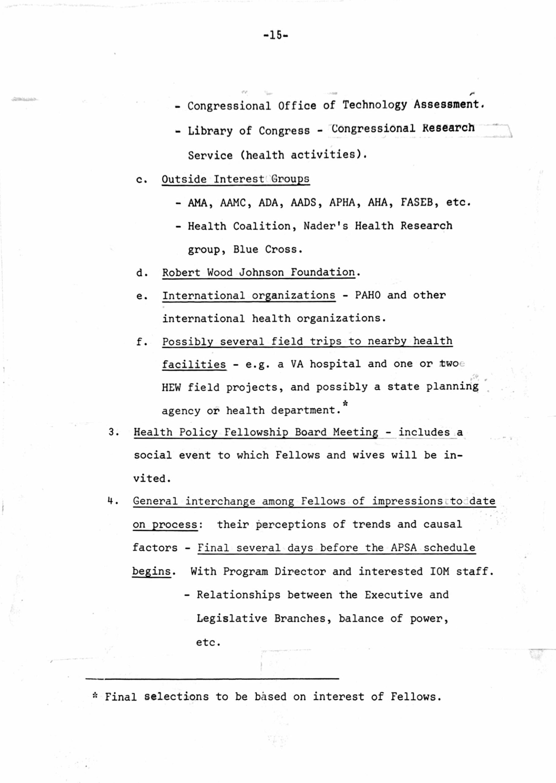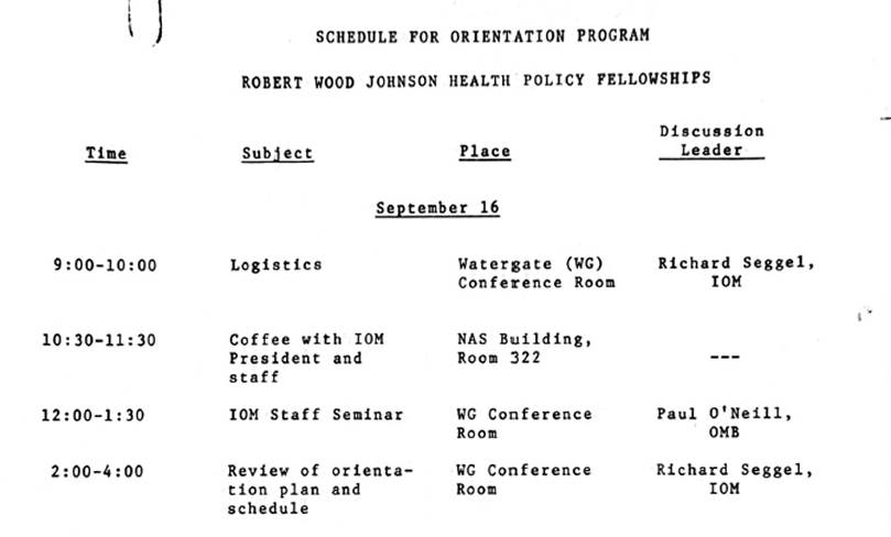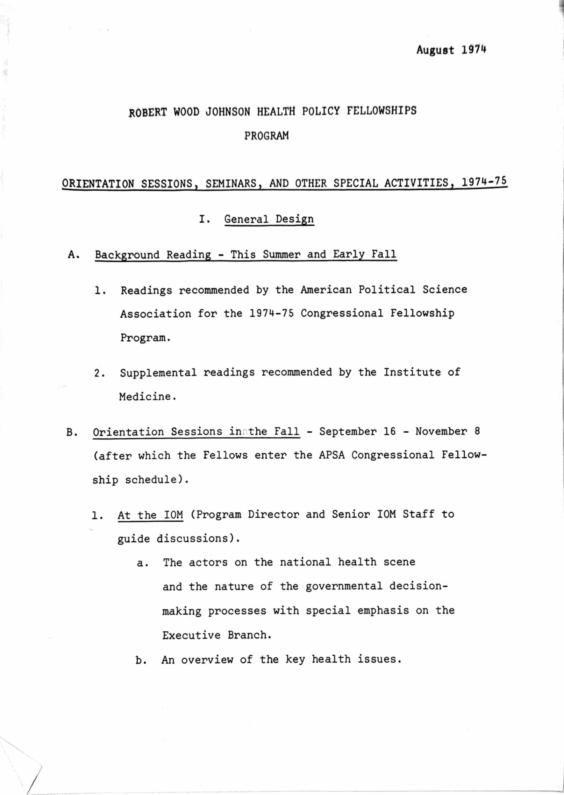 “Fellows would be expected to mọve to Washington, D.C. in time for the opening sessions, and to spend a period of six to eight weeks in an orientation program centered on matters of health and health policy organized by a staff based at the Institute of Medicine. This portion might include seminars to familiarize fellows with health agencies in government, congressional committees responsible for health affairs and the areas covered by each, problems and opportunities in health policy as viewed by the IOM staff and various IOM members, guest experts, HEW staff and congressional staff. Site visits to the various agencies might be scheduled. Insofar as it would be possible and consistent with the development of seminars, the preliminary program should be tailored to each fellow’s individual interests.