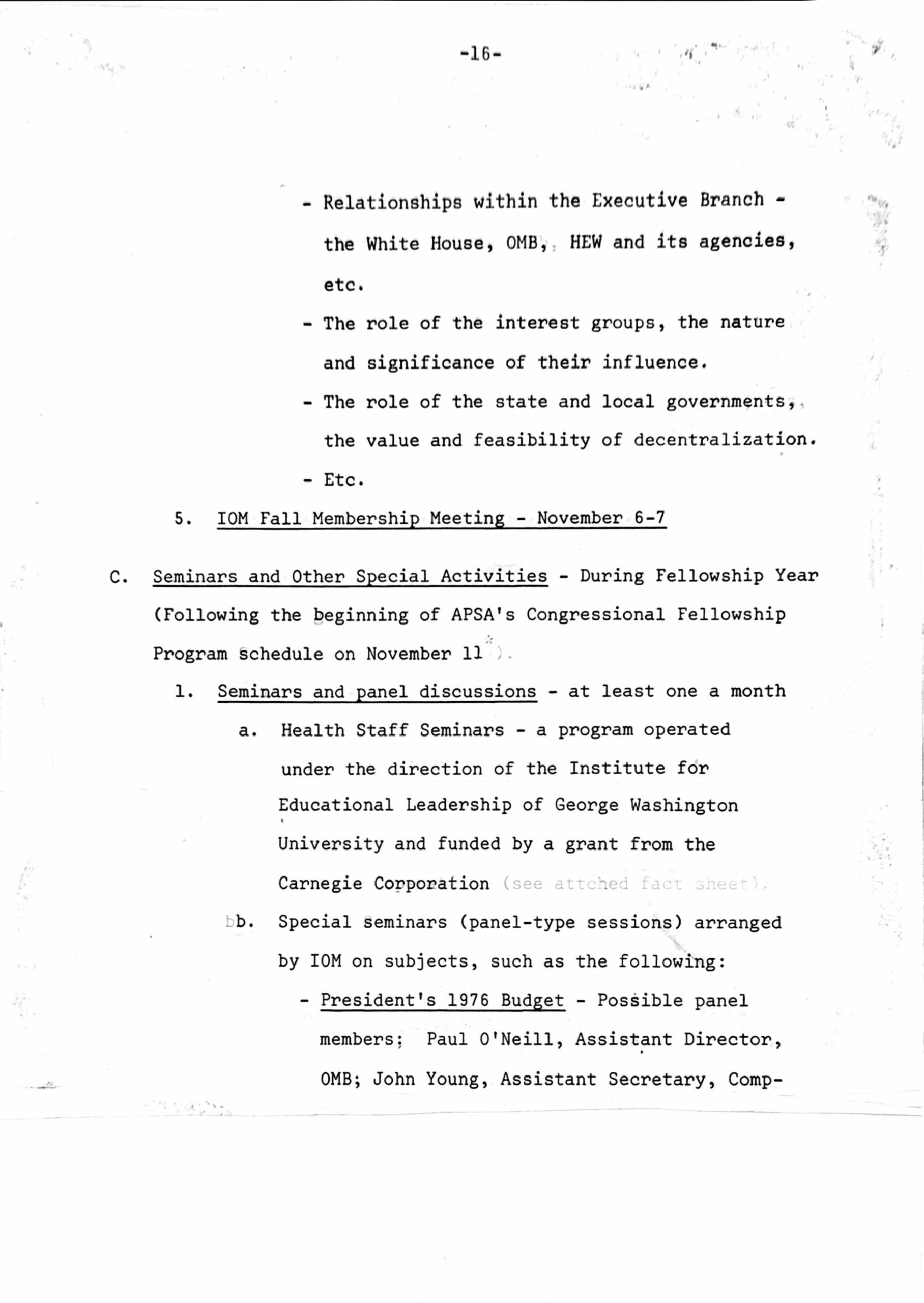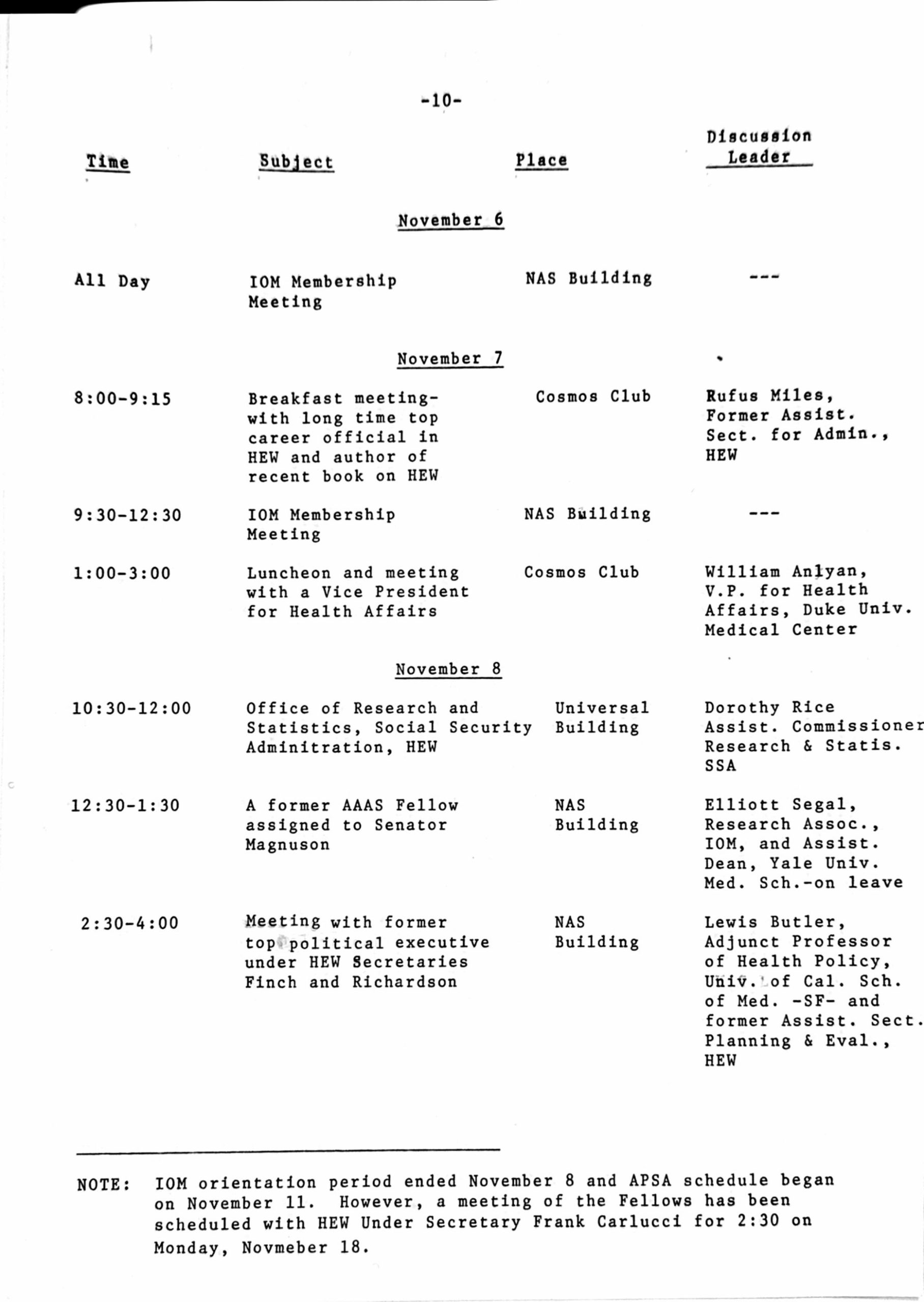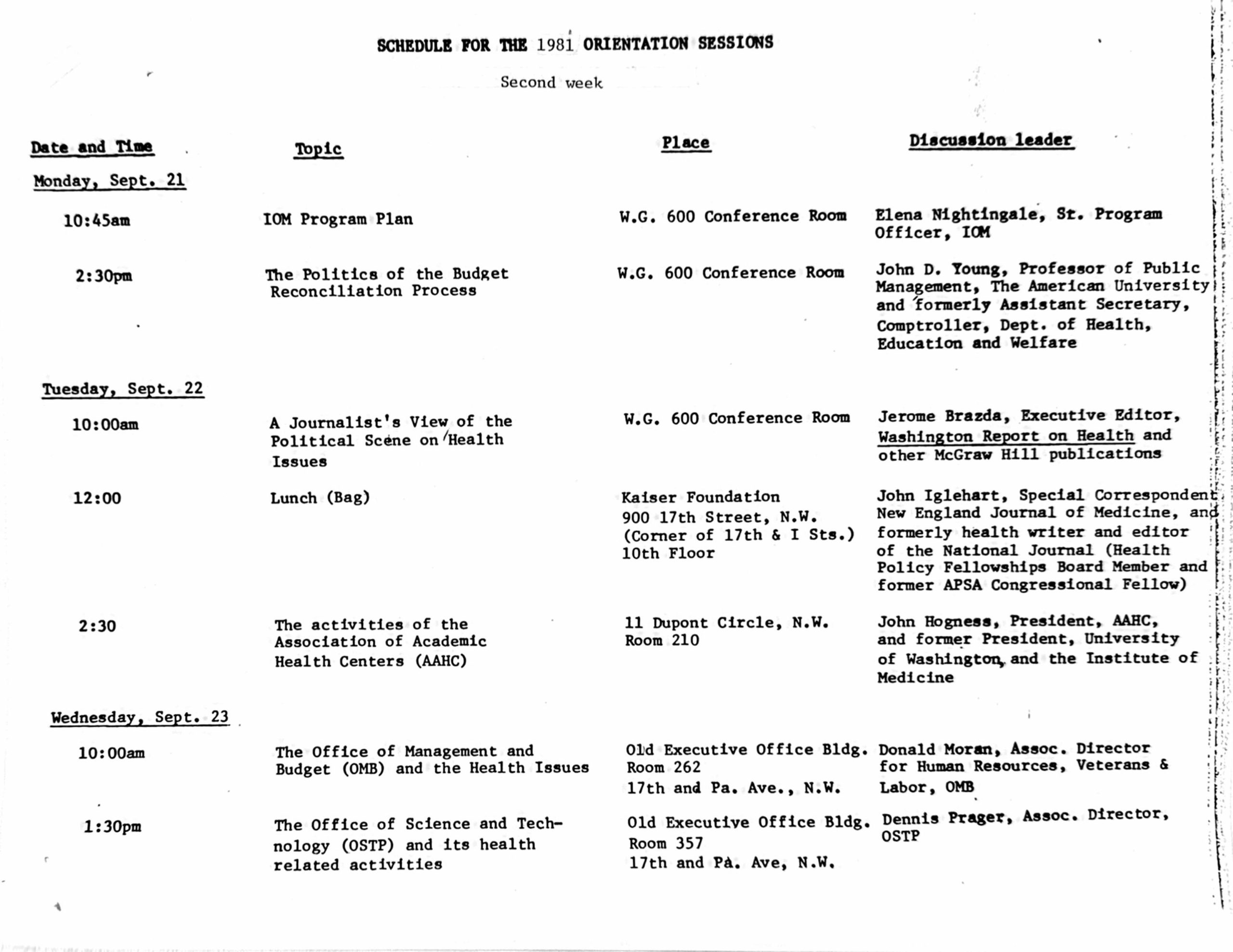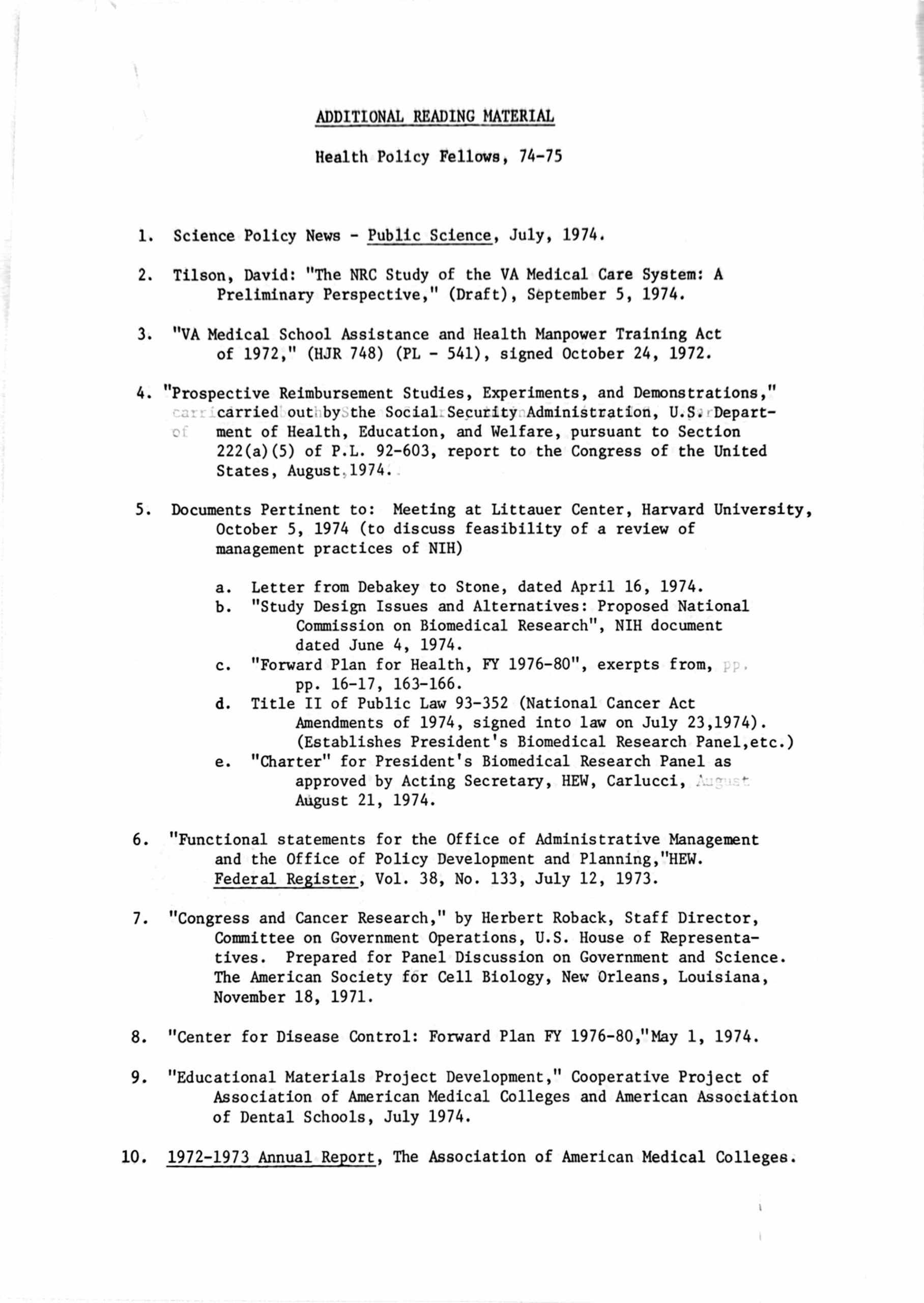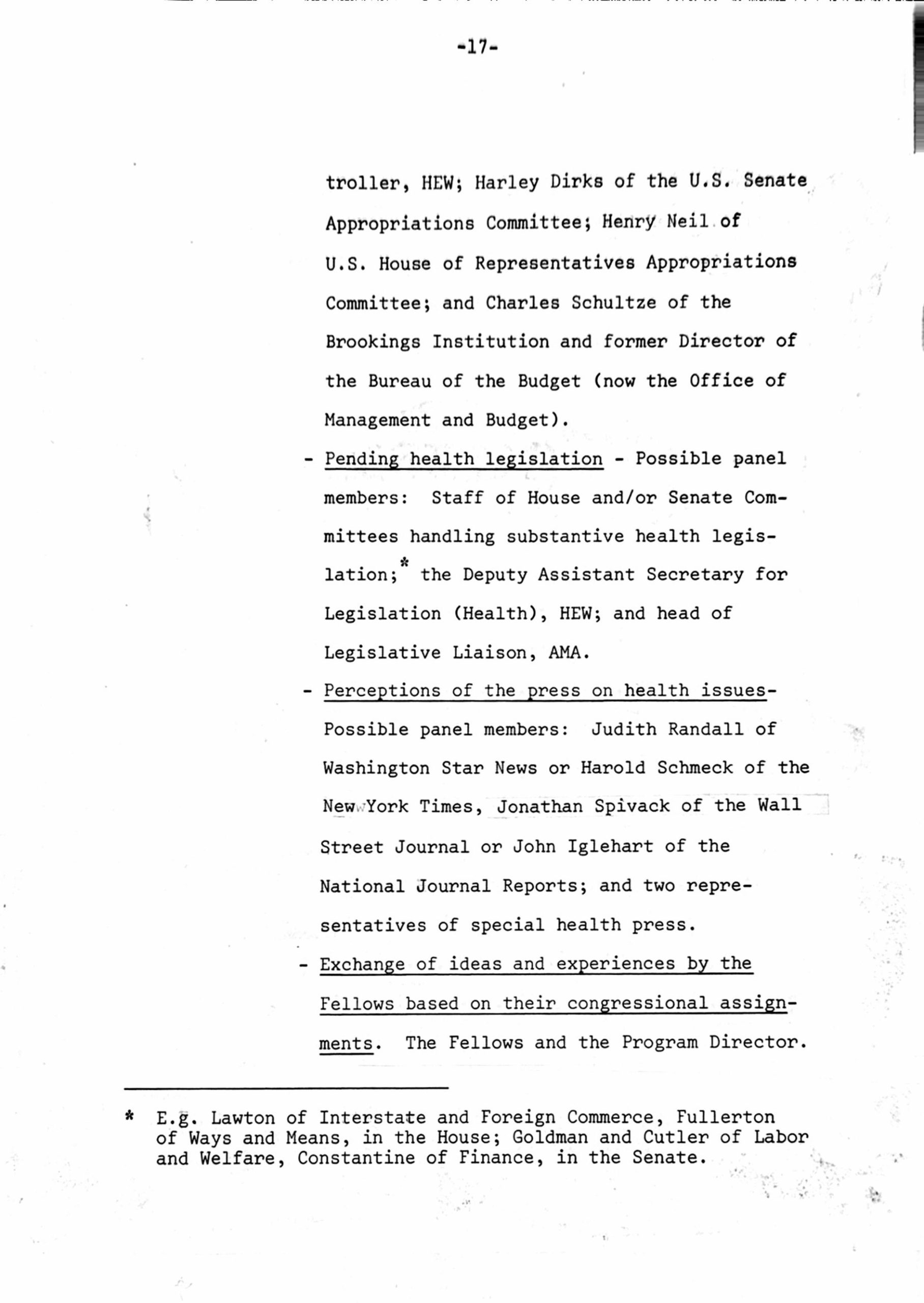 “Fellows would be expected to mọve to Washington, D.C. in time for the opening sessions, and to spend a period of six to eight weeks in an orientation program centered on matters of health and health policy organized by a staff based at the Institute of Medicine. This portion might include seminars to familiarize fellows with health agencies in government, congressional committees responsible for health affairs and the areas covered by each, problems and opportunities in health policy as viewed by the IOM staff and various IOM members, guest experts, HEW staff and congressional staff. Site visits to the various agencies might be scheduled. Insofar as it would be possible and consistent with the development of seminars, the preliminary program should be tailored to each fellow’s individual interests.