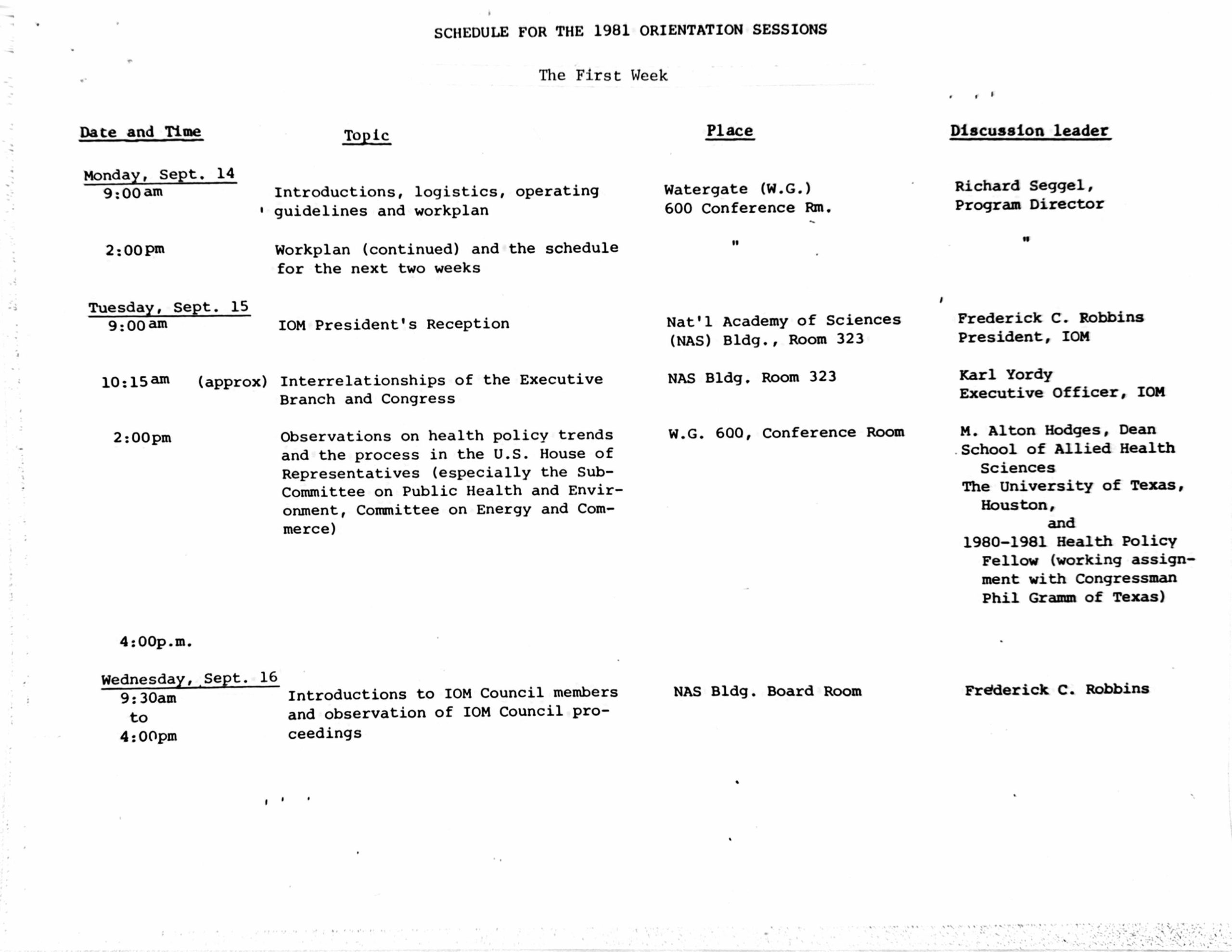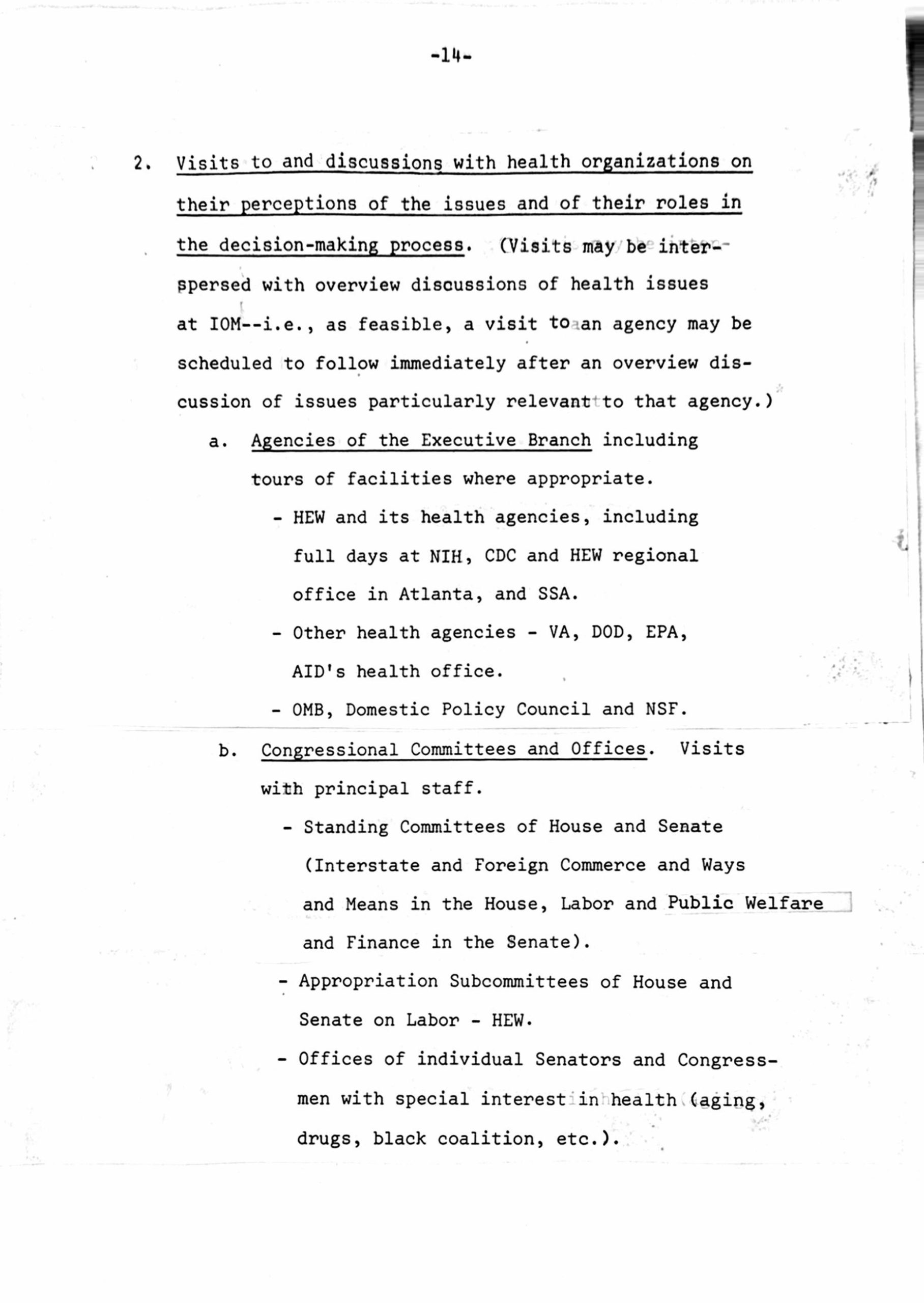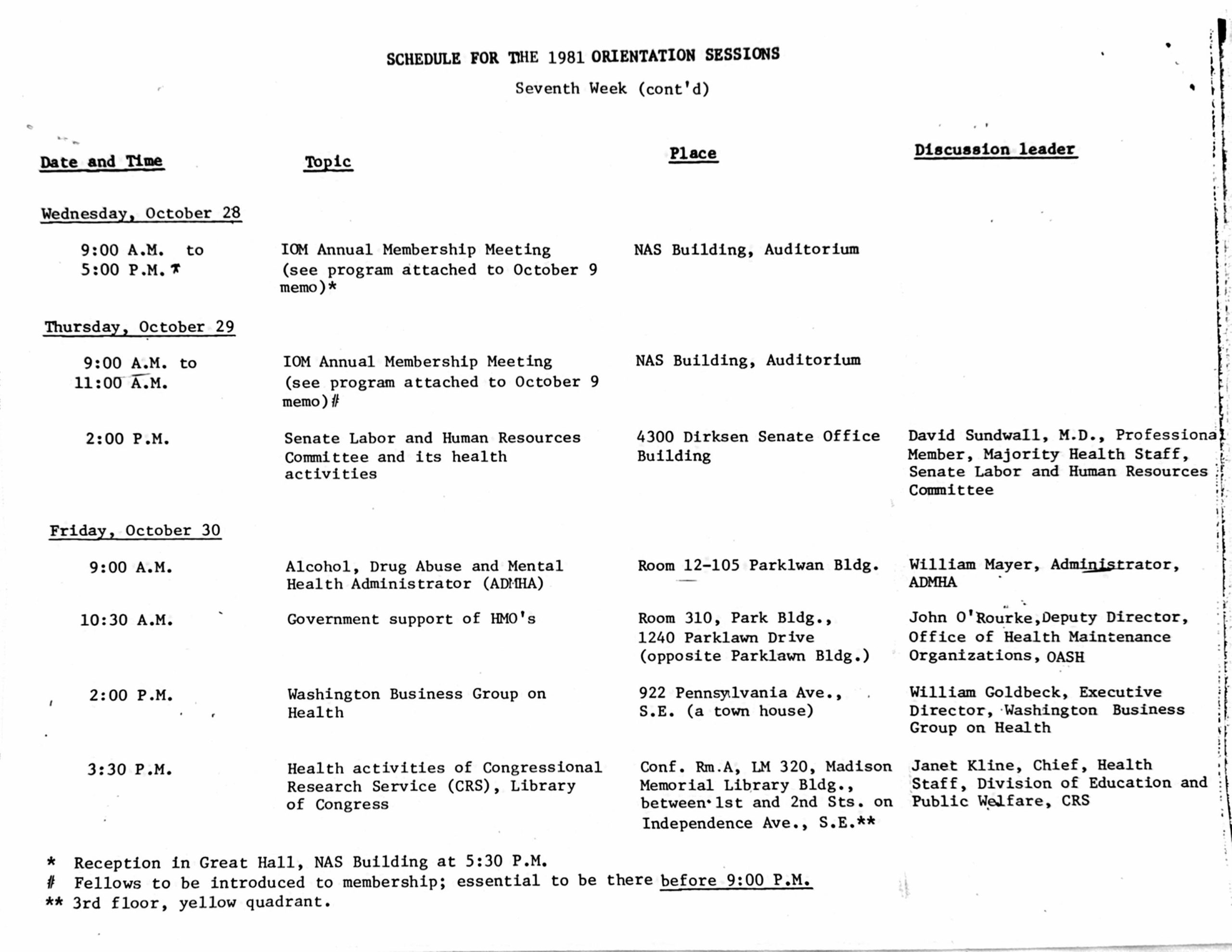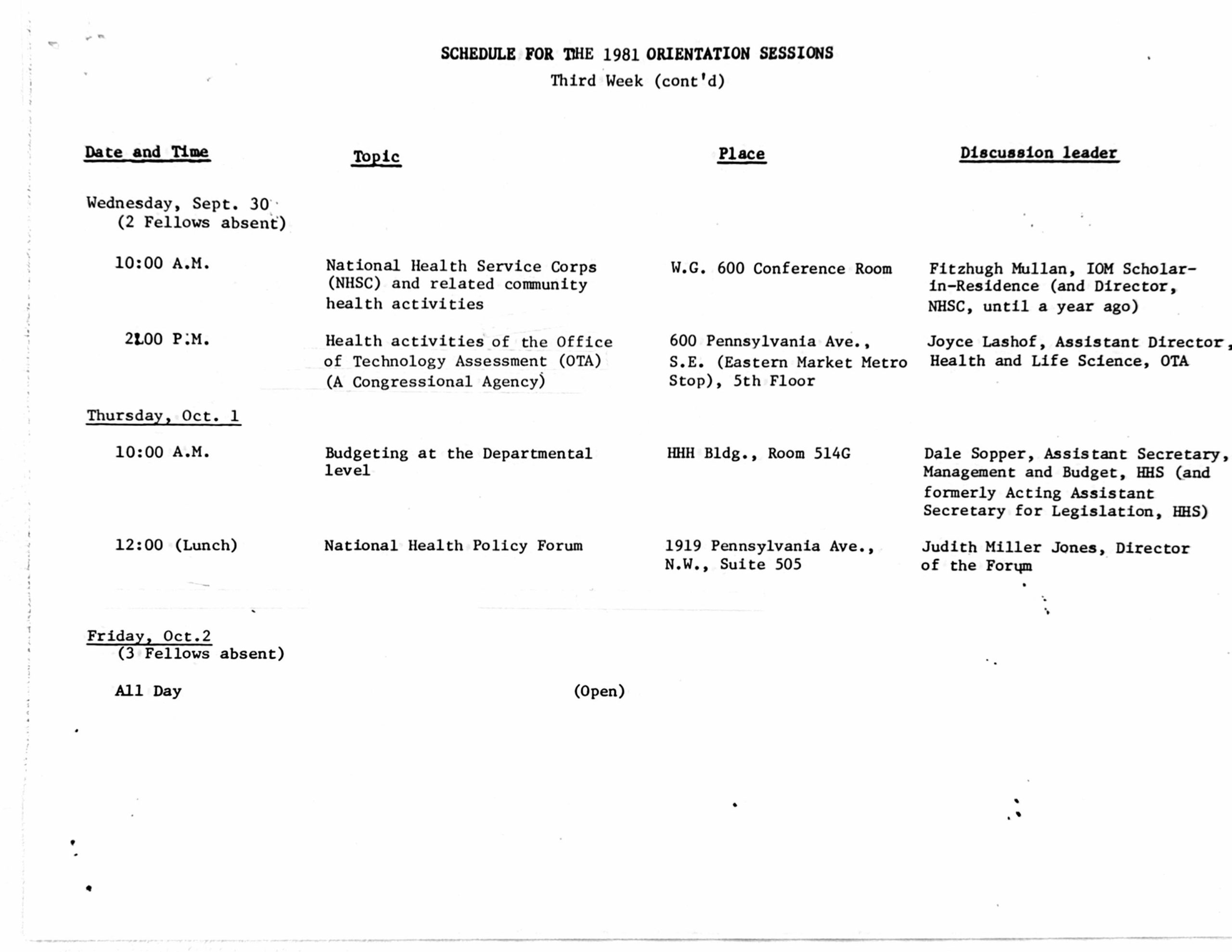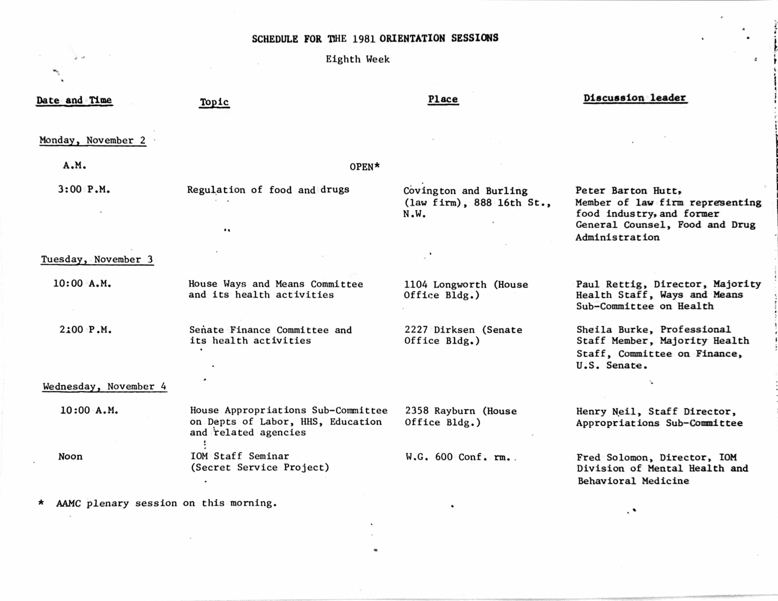 “Fellows would be expected to mọve to Washington, D.C. in time for the opening sessions, and to spend a period of six to eight weeks in an orientation program centered on matters of health and health policy organized by a staff based at the Institute of Medicine. This portion might include seminars to familiarize fellows with health agencies in government, congressional committees responsible for health affairs and the areas covered by each, problems and opportunities in health policy as viewed by the IOM staff and various IOM members, guest experts, HEW staff and congressional staff. Site visits to the various agencies might be scheduled. Insofar as it would be possible and consistent with the development of seminars, the preliminary program should be tailored to each fellow’s individual interests.