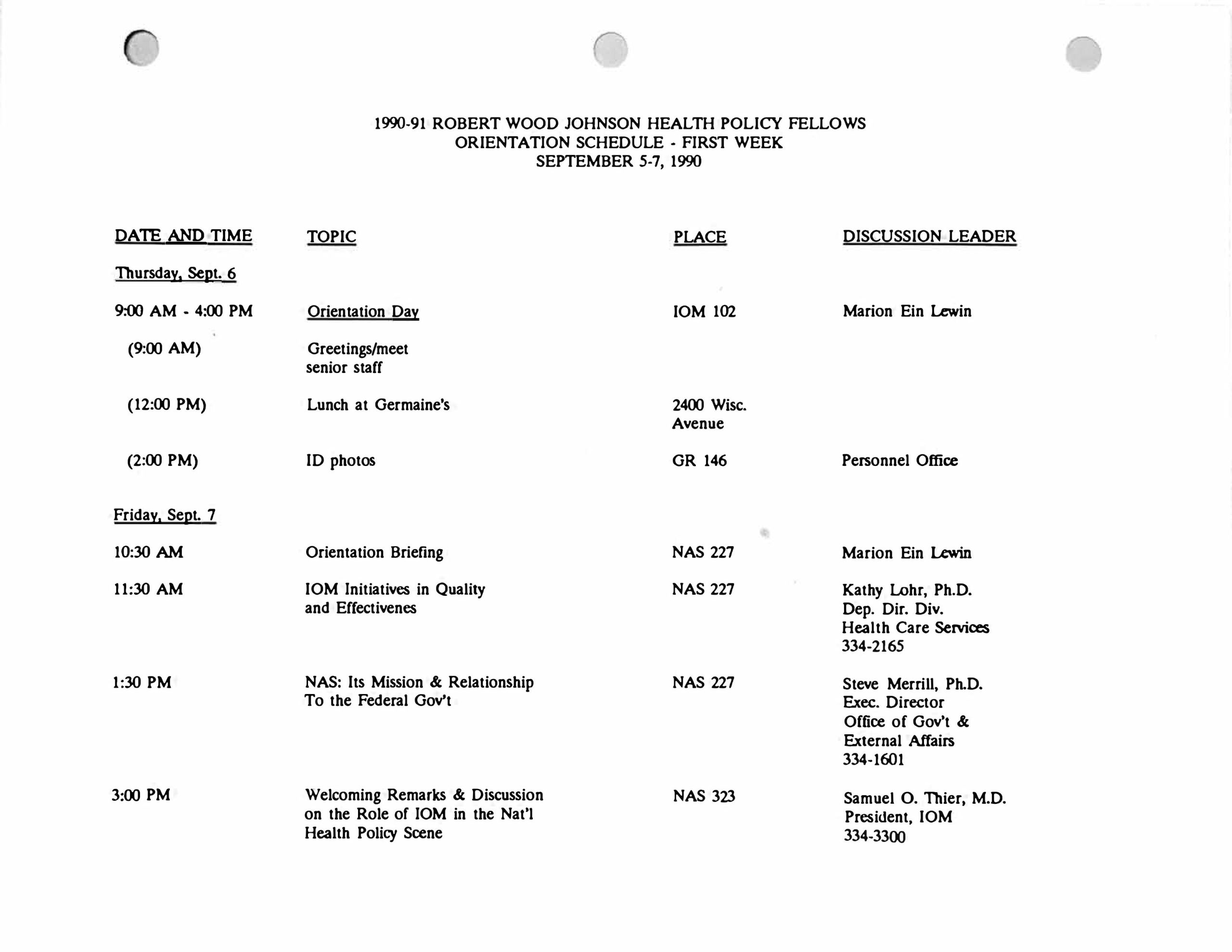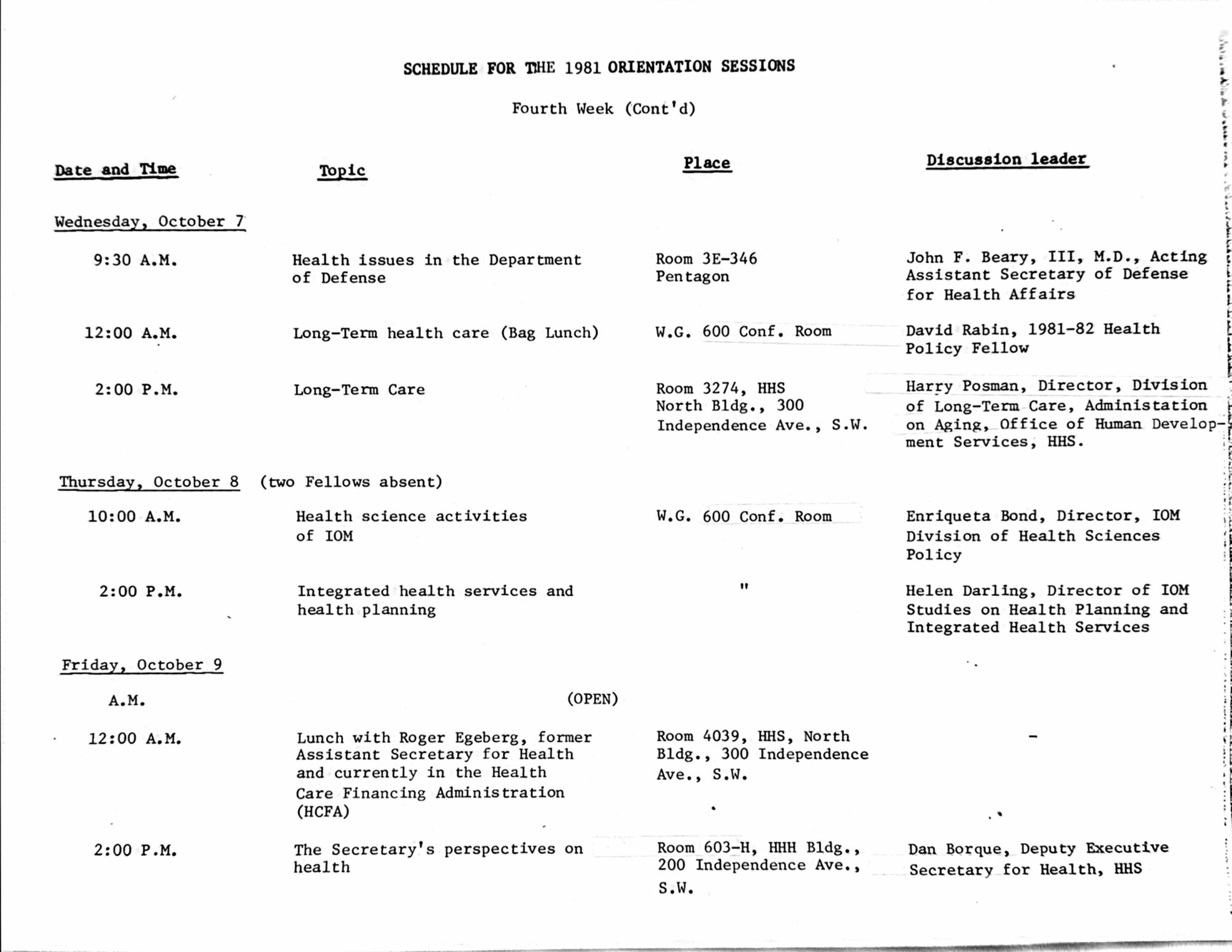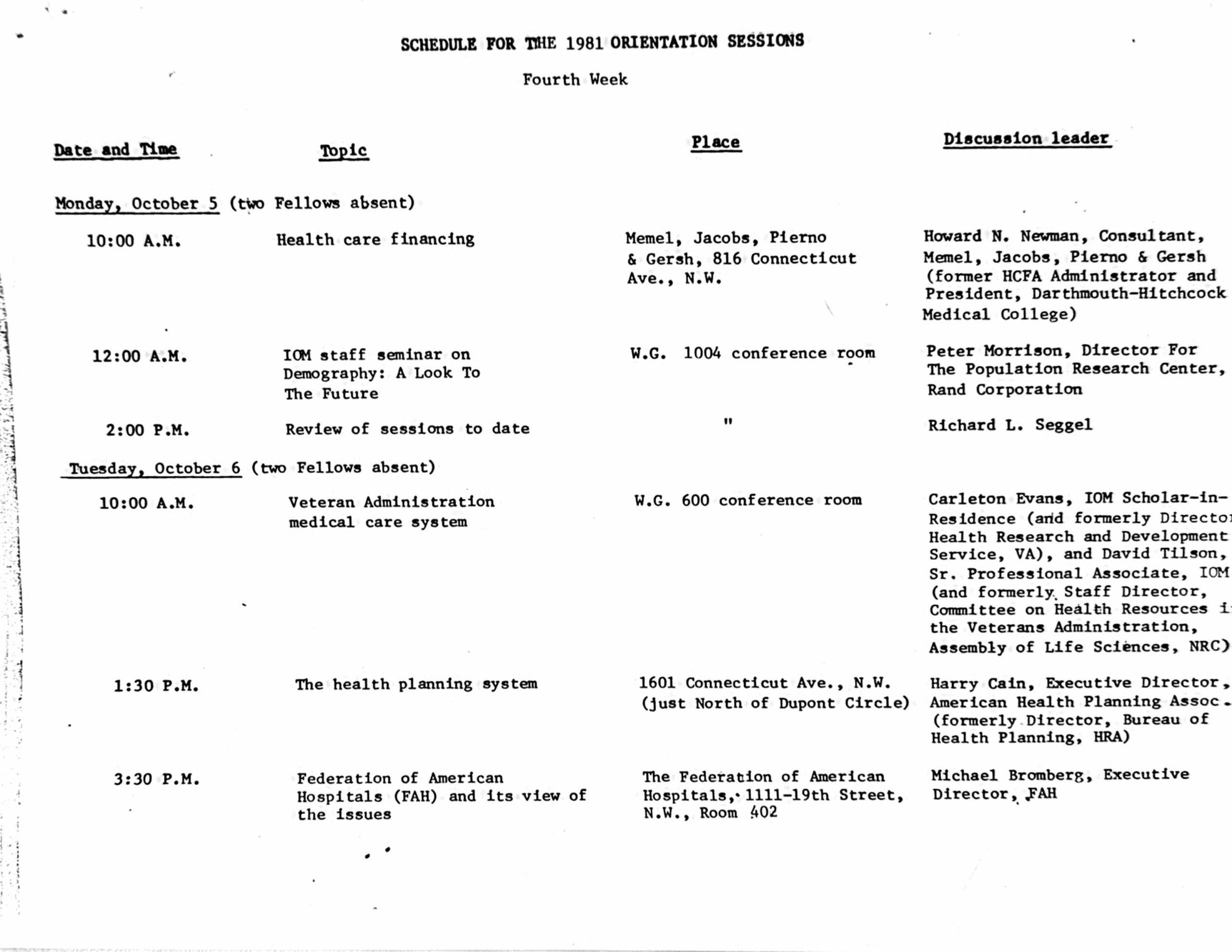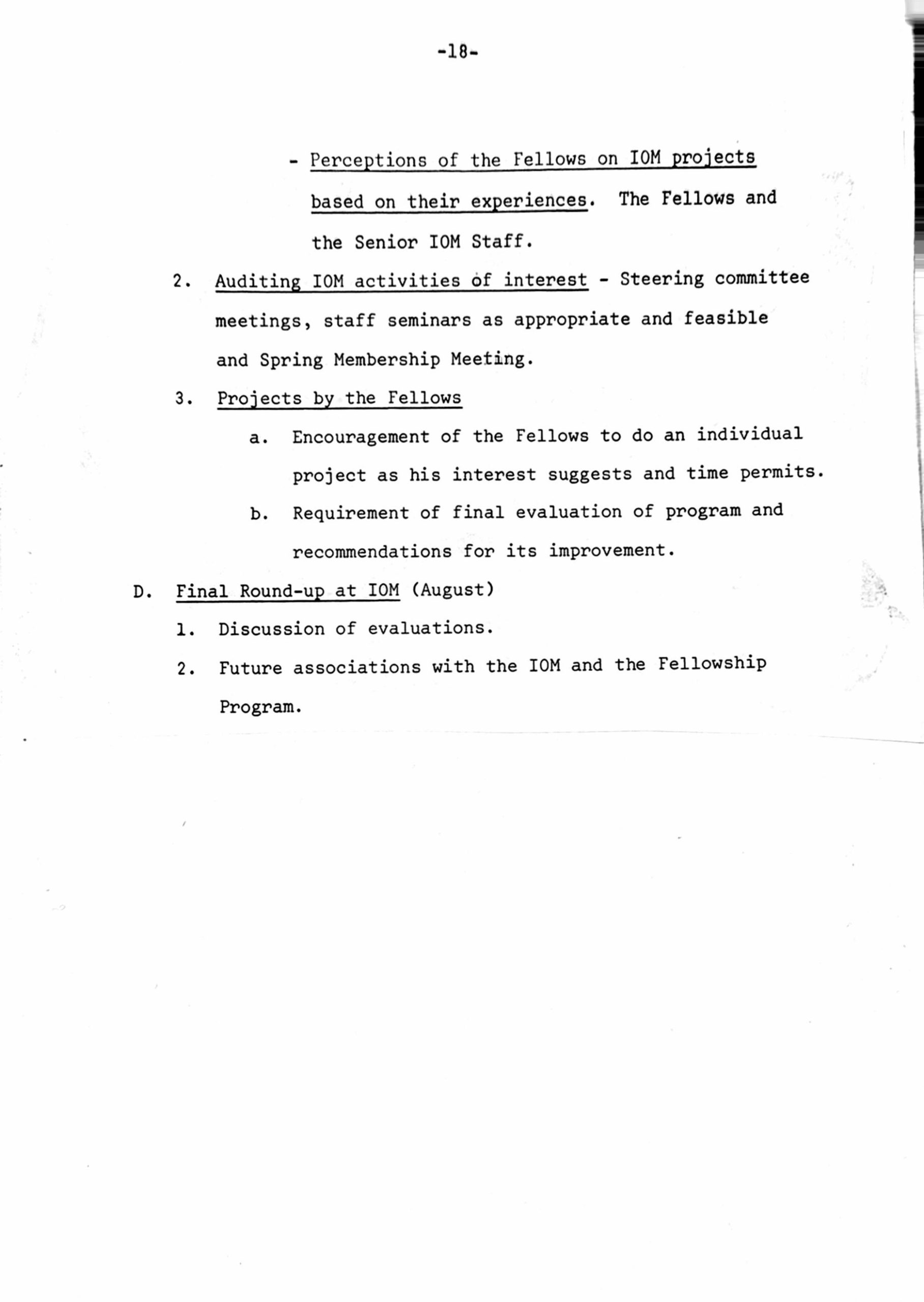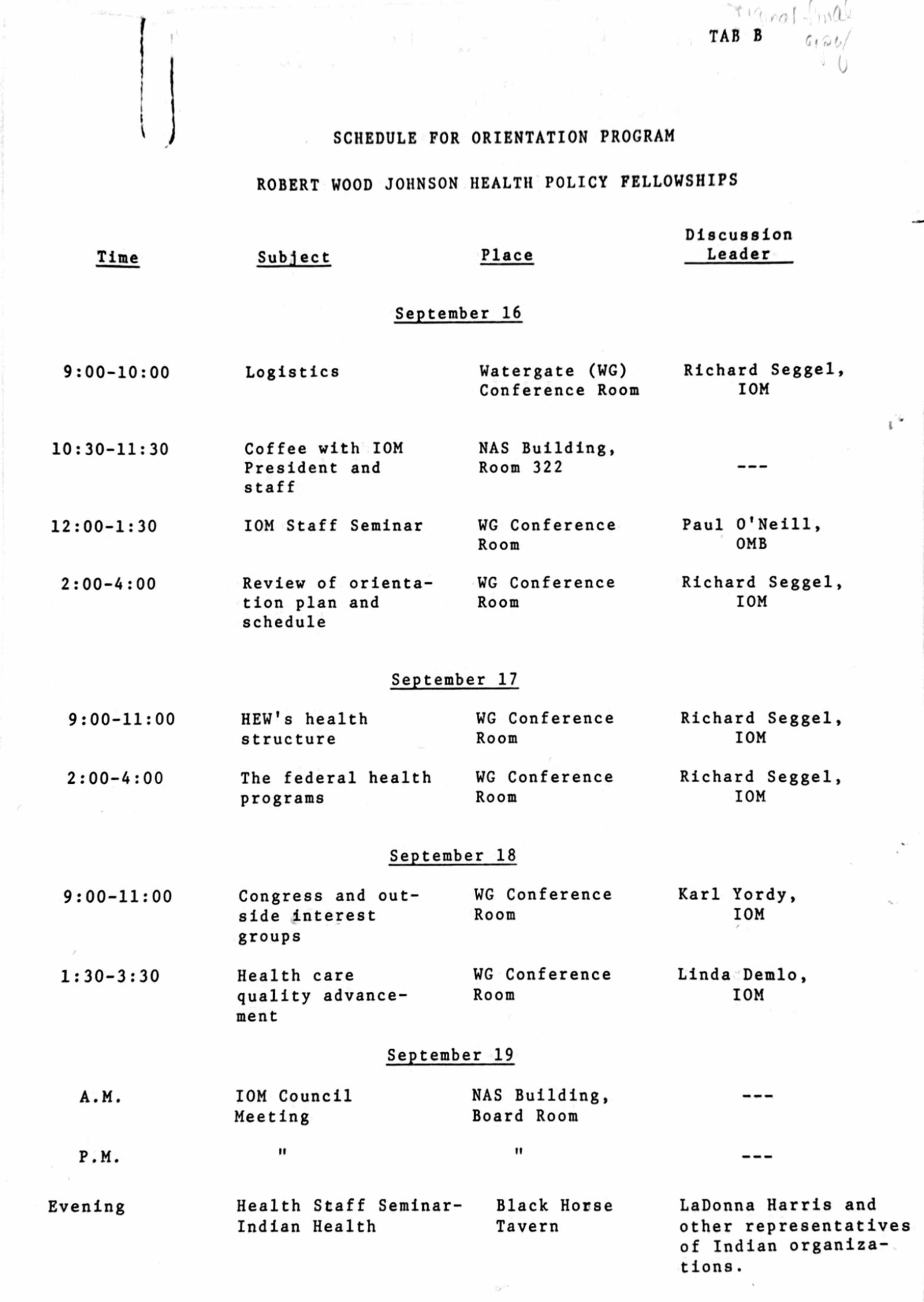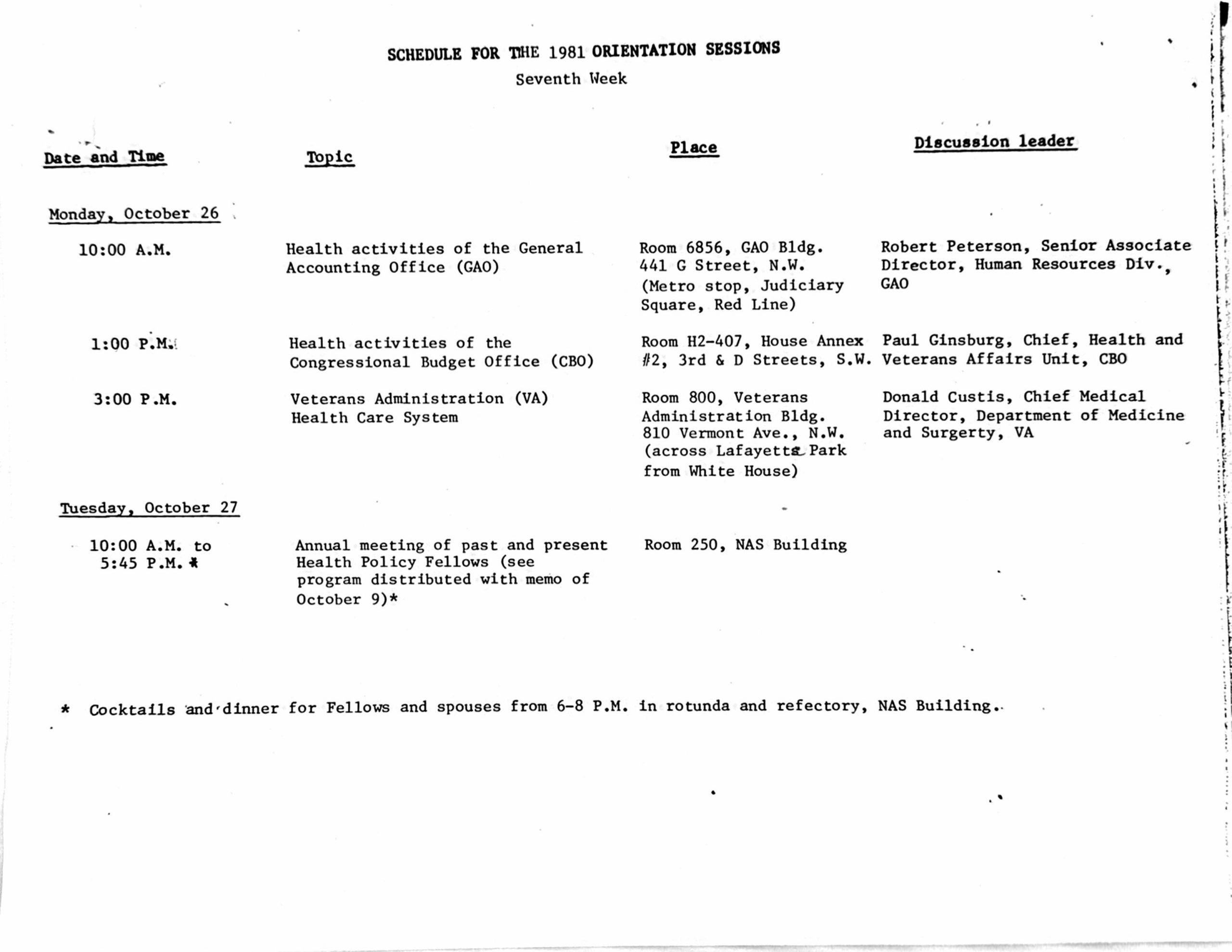 “Fellows would be expected to mọve to Washington, D.C. in time for the opening sessions, and to spend a period of six to eight weeks in an orientation program centered on matters of health and health policy organized by a staff based at the Institute of Medicine. This portion might include seminars to familiarize fellows with health agencies in government, congressional committees responsible for health affairs and the areas covered by each, problems and opportunities in health policy as viewed by the IOM staff and various IOM members, guest experts, HEW staff and congressional staff. Site visits to the various agencies might be scheduled. Insofar as it would be possible and consistent with the development of seminars, the preliminary program should be tailored to each fellow’s individual interests.