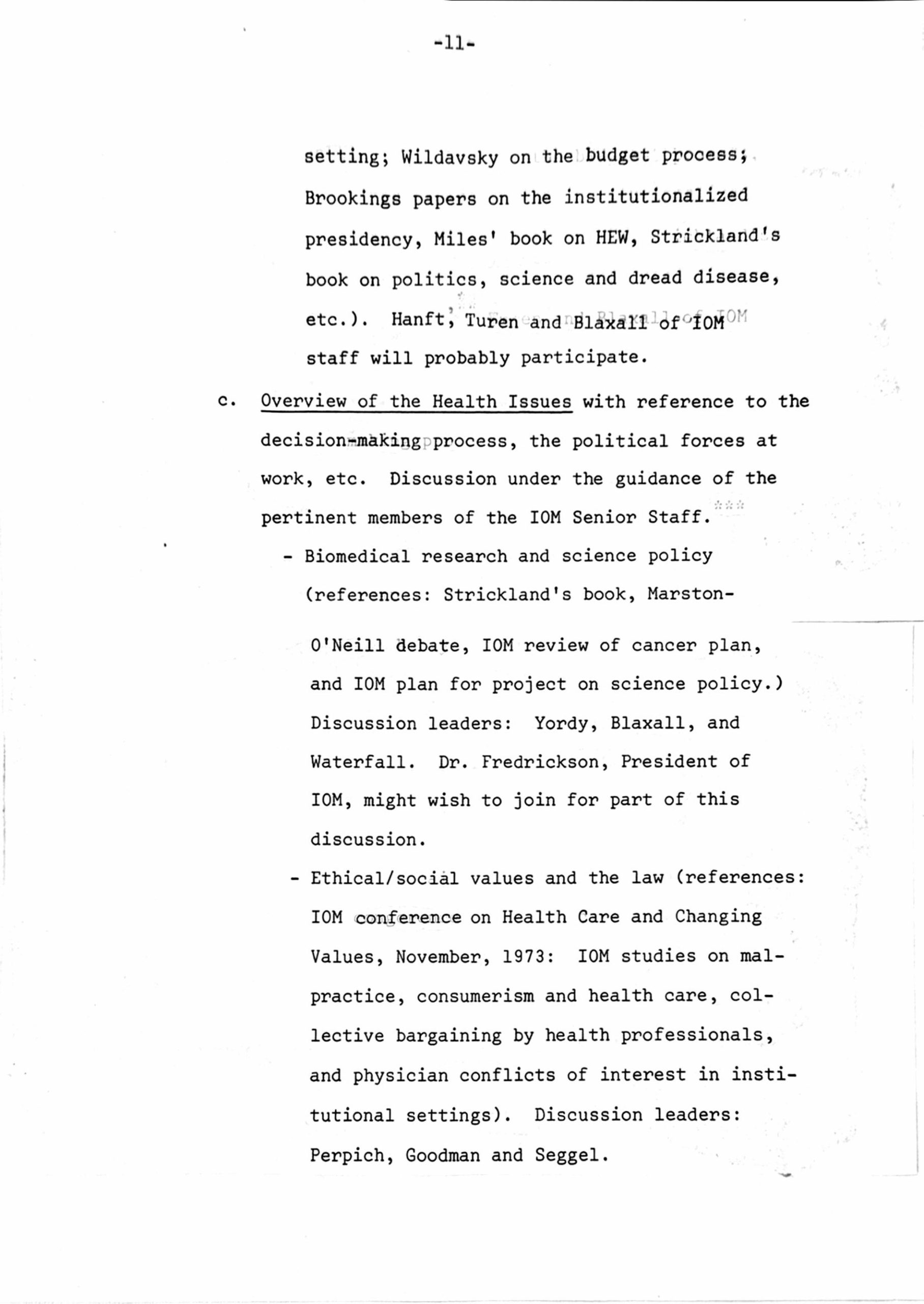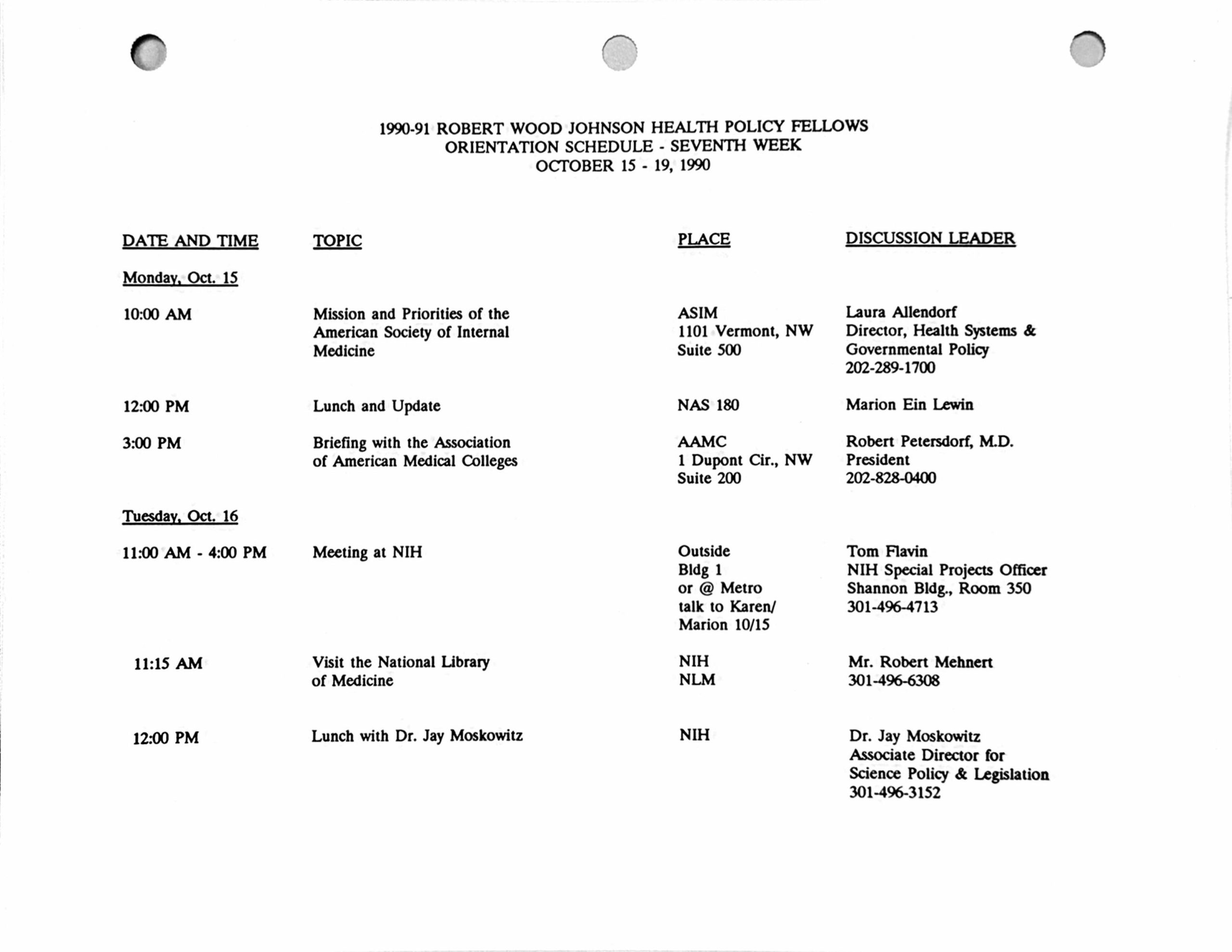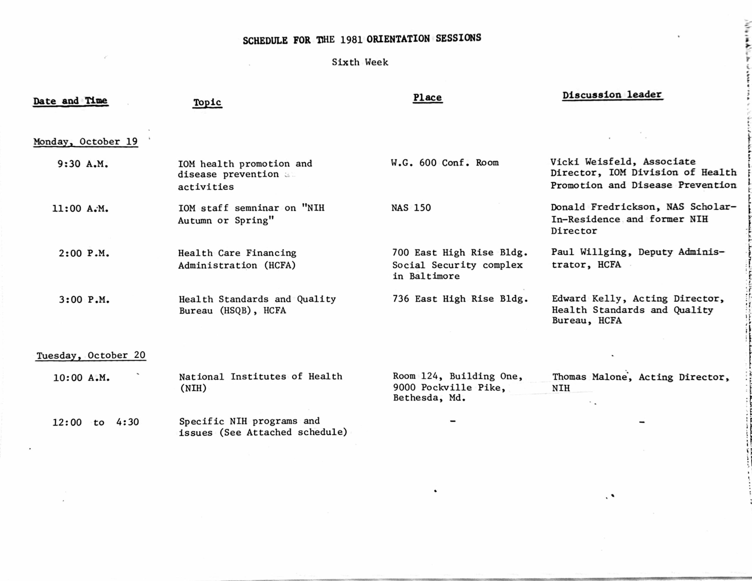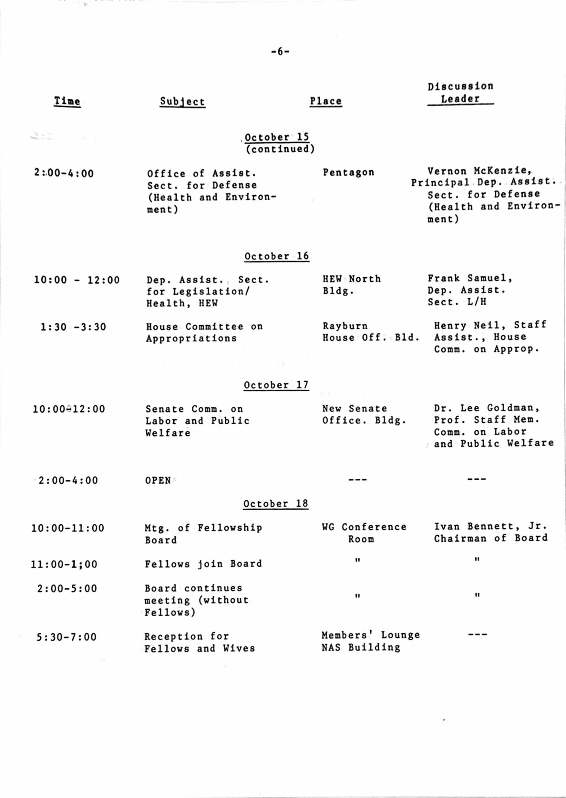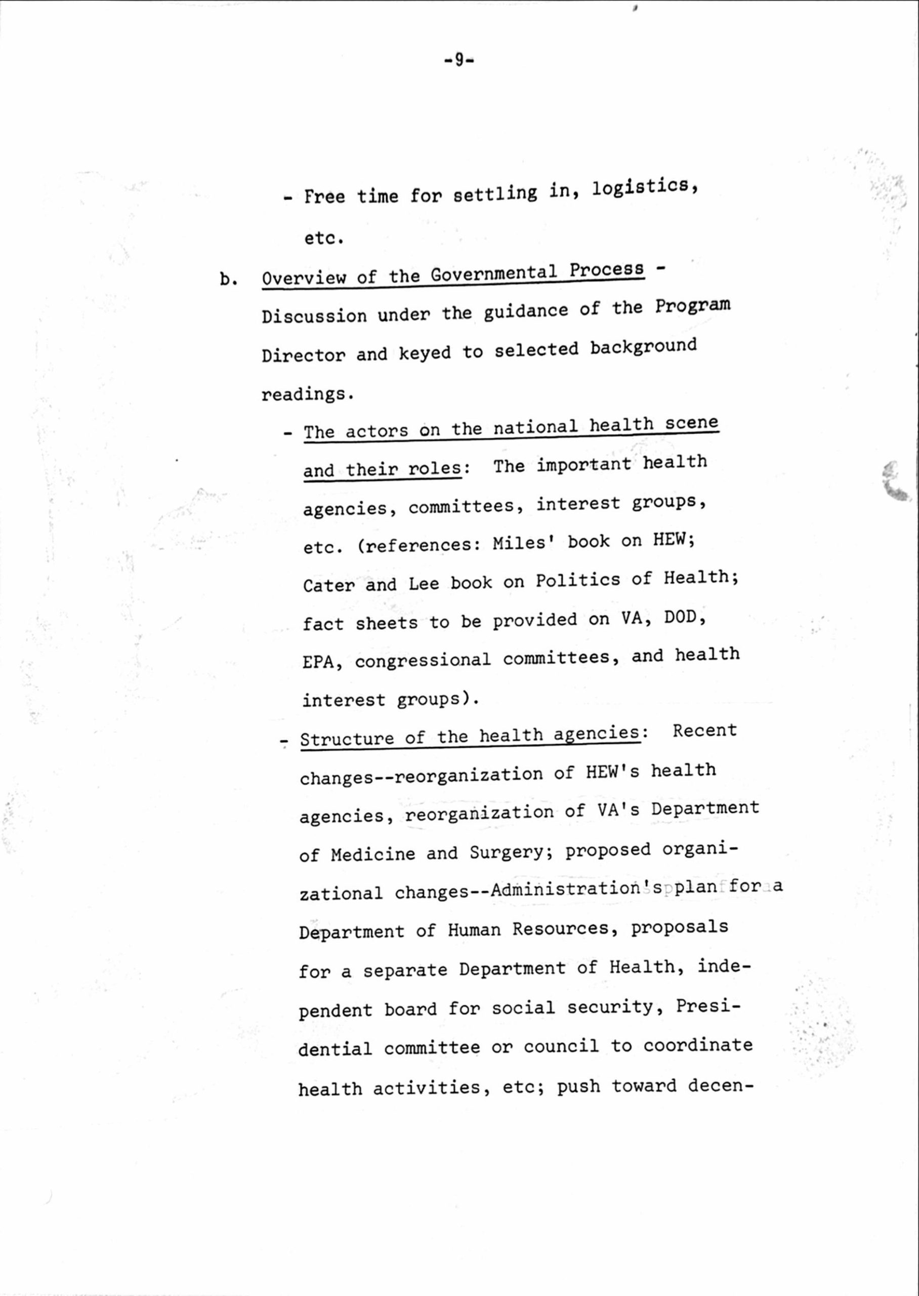 “Fellows would be expected to mọve to Washington, D.C. in time for the opening sessions, and to spend a period of six to eight weeks in an orientation program centered on matters of health and health policy organized by a staff based at the Institute of Medicine. This portion might include seminars to familiarize fellows with health agencies in government, congressional committees responsible for health affairs and the areas covered by each, problems and opportunities in health policy as viewed by the IOM staff and various IOM members, guest experts, HEW staff and congressional staff. Site visits to the various agencies might be scheduled. Insofar as it would be possible and consistent with the development of seminars, the preliminary program should be tailored to each fellow’s individual interests.