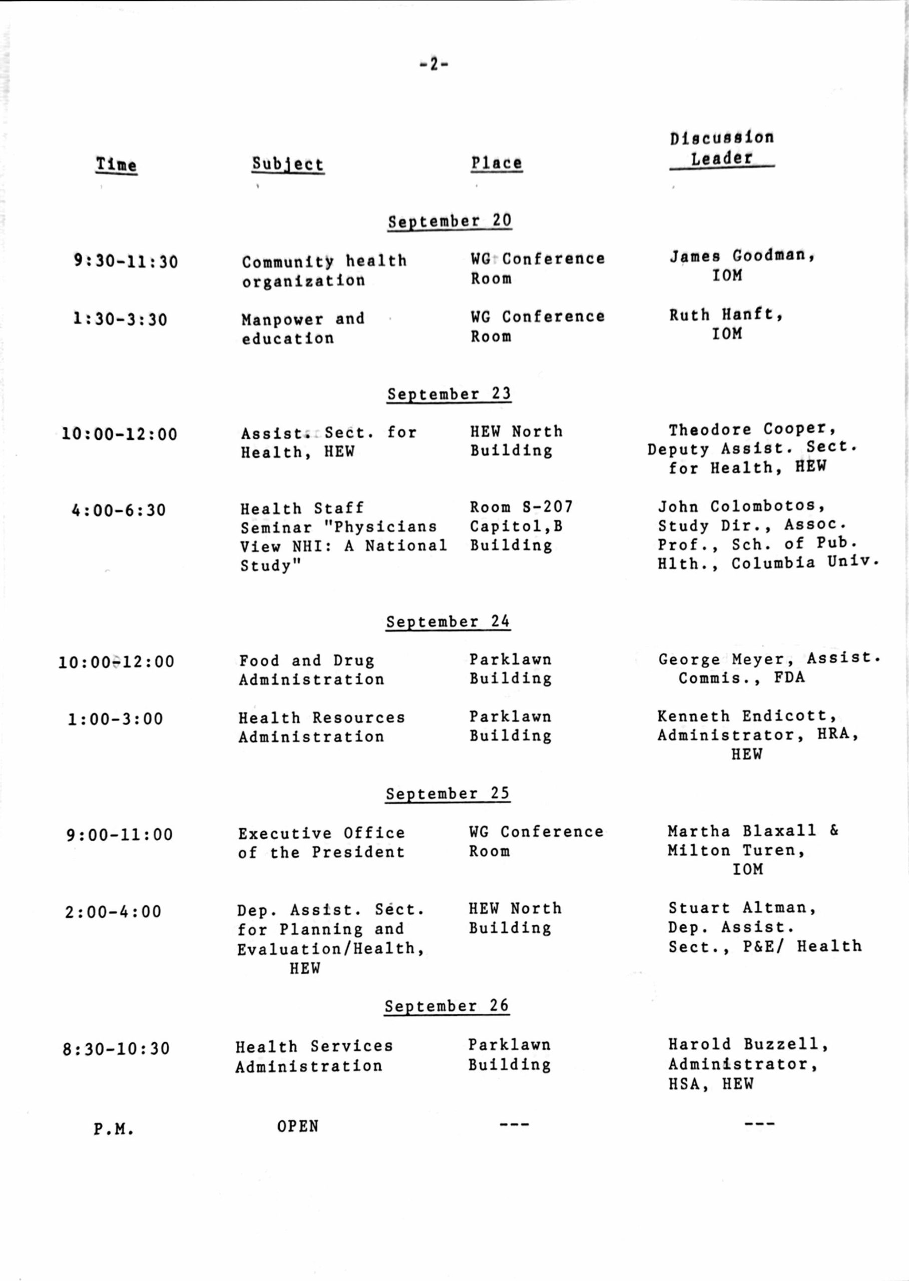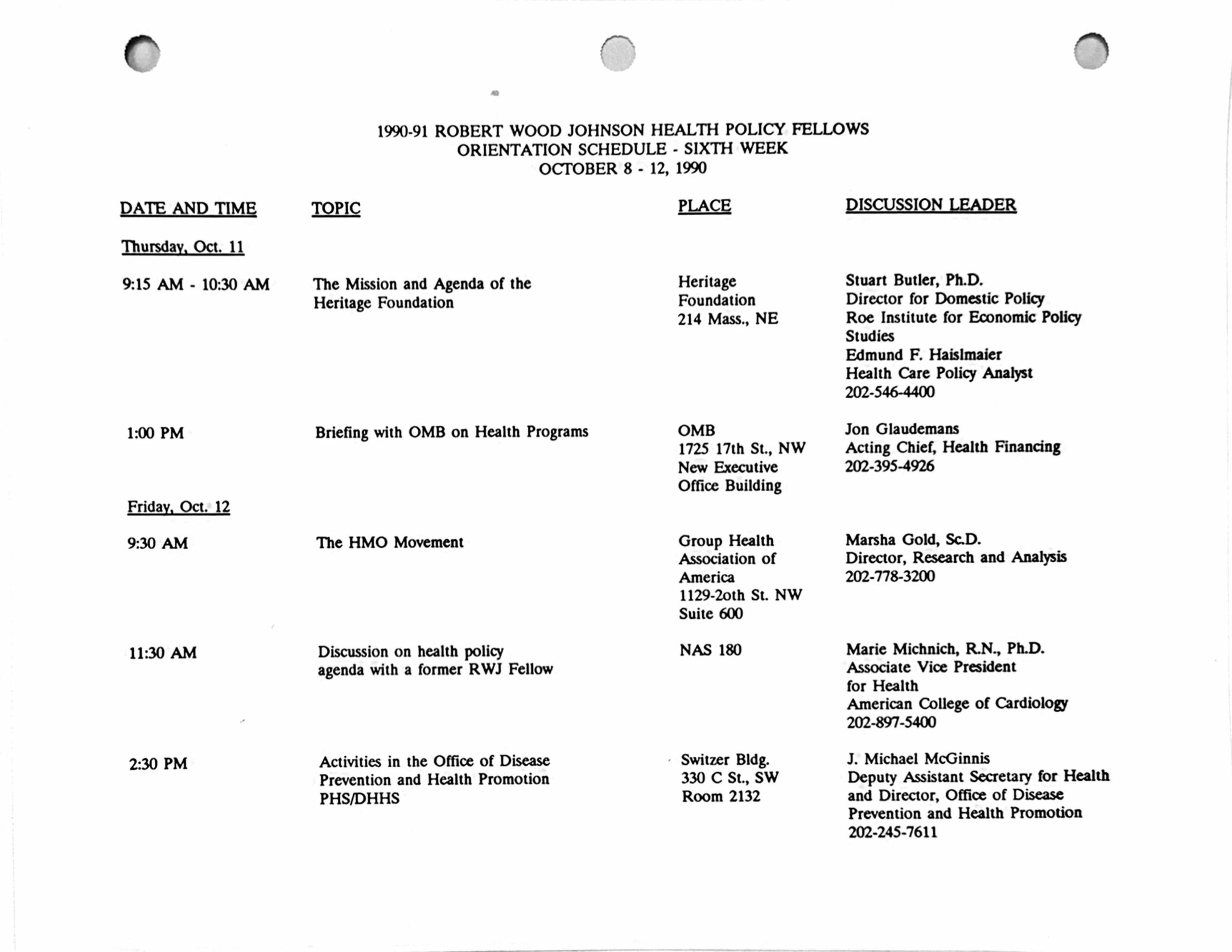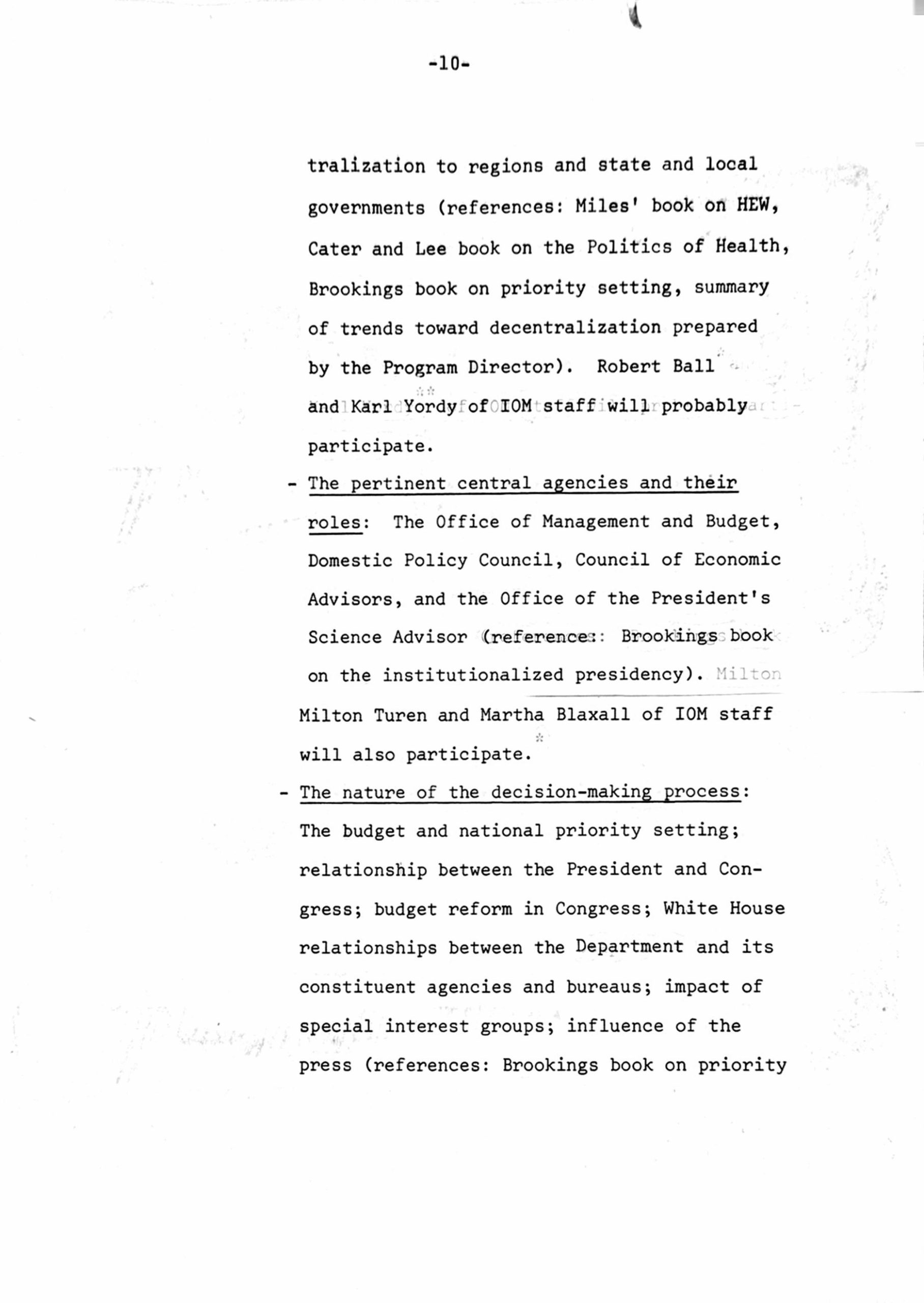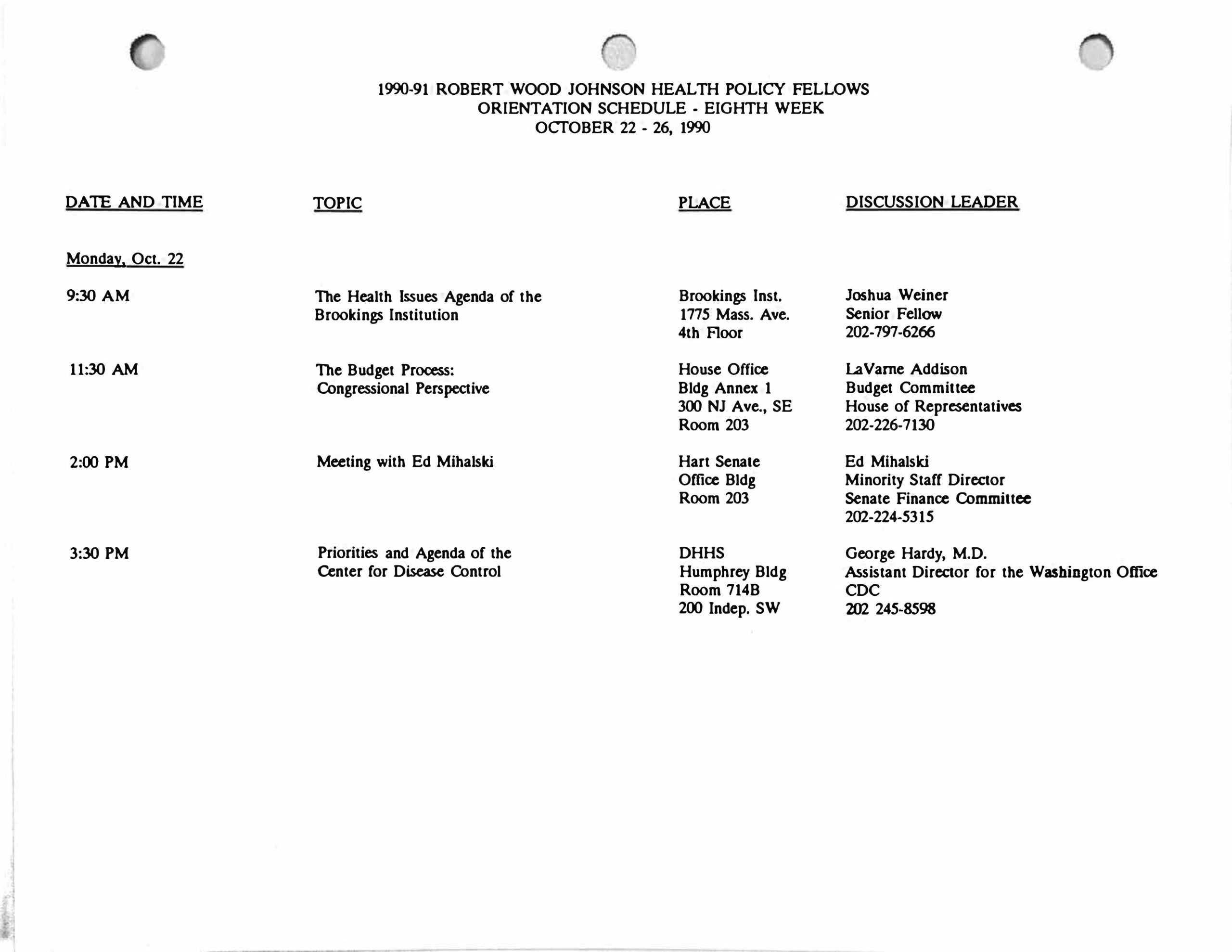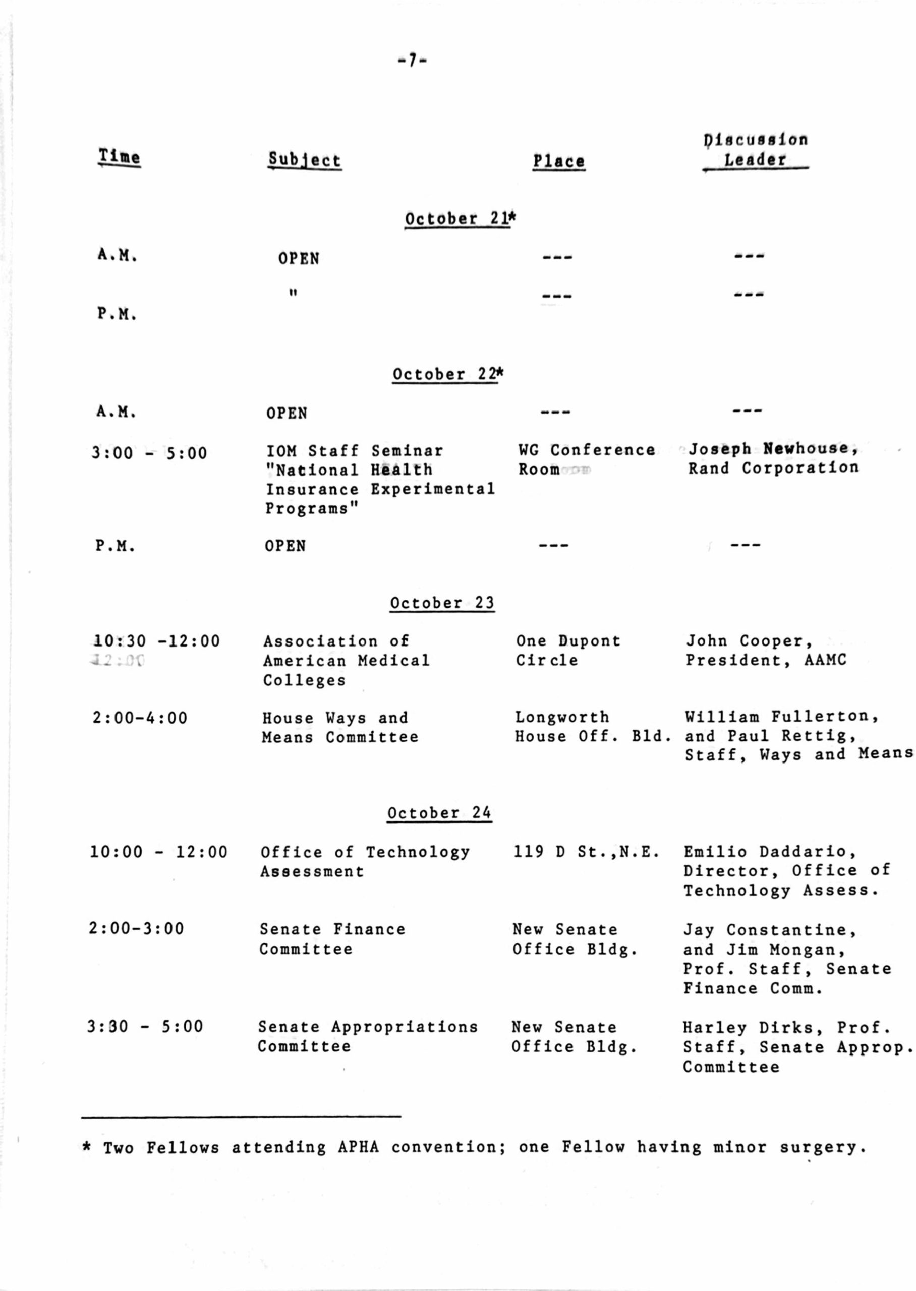 “Fellows would be expected to mọve to Washington, D.C. in time for the opening sessions, and to spend a period of six to eight weeks in an orientation program centered on matters of health and health policy organized by a staff based at the Institute of Medicine. This portion might include seminars to familiarize fellows with health agencies in government, congressional committees responsible for health affairs and the areas covered by each, problems and opportunities in health policy as viewed by the IOM staff and various IOM members, guest experts, HEW staff and congressional staff. Site visits to the various agencies might be scheduled. Insofar as it would be possible and consistent with the development of seminars, the preliminary program should be tailored to each fellow’s individual interests.