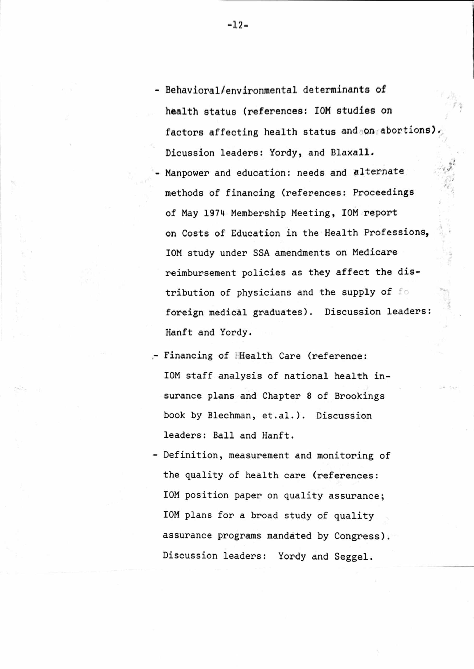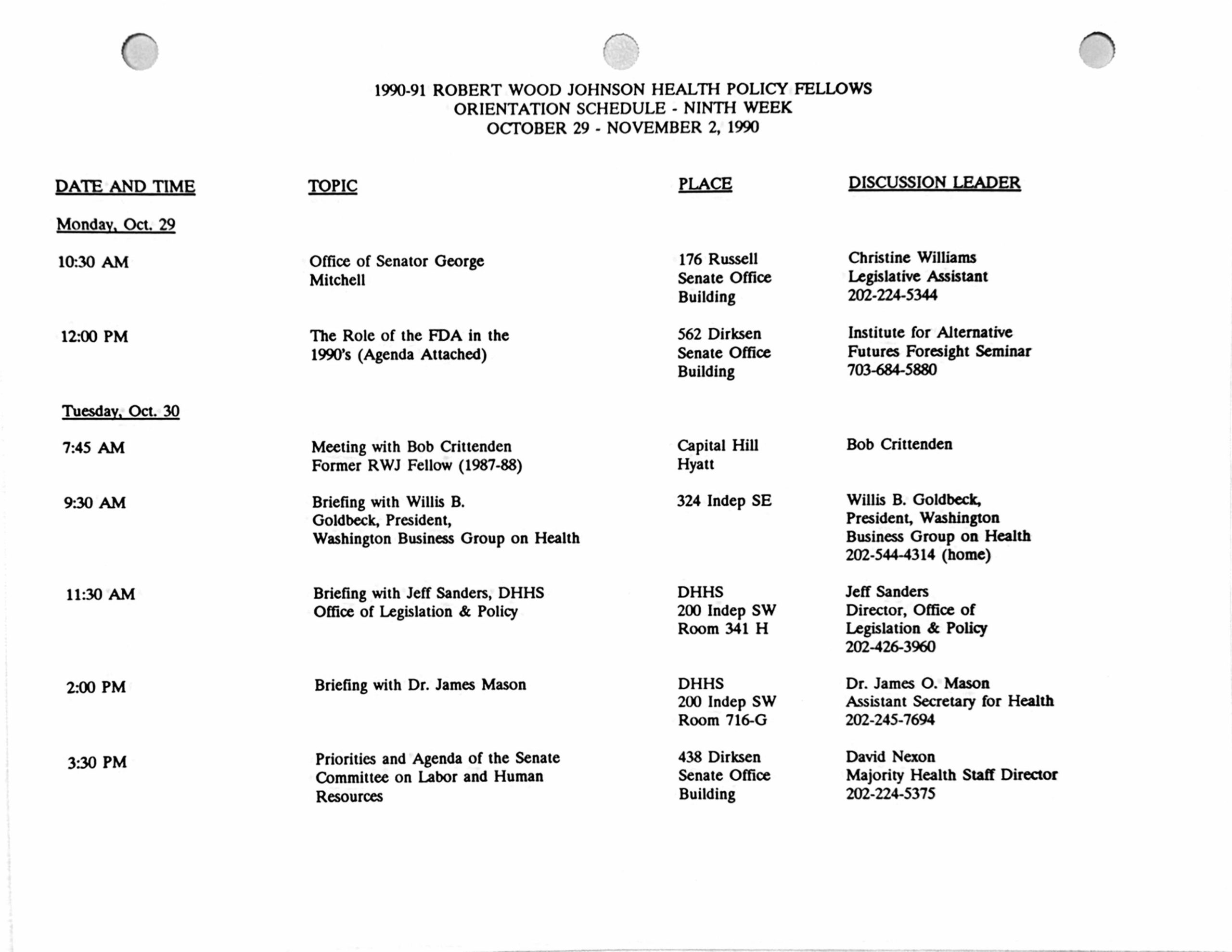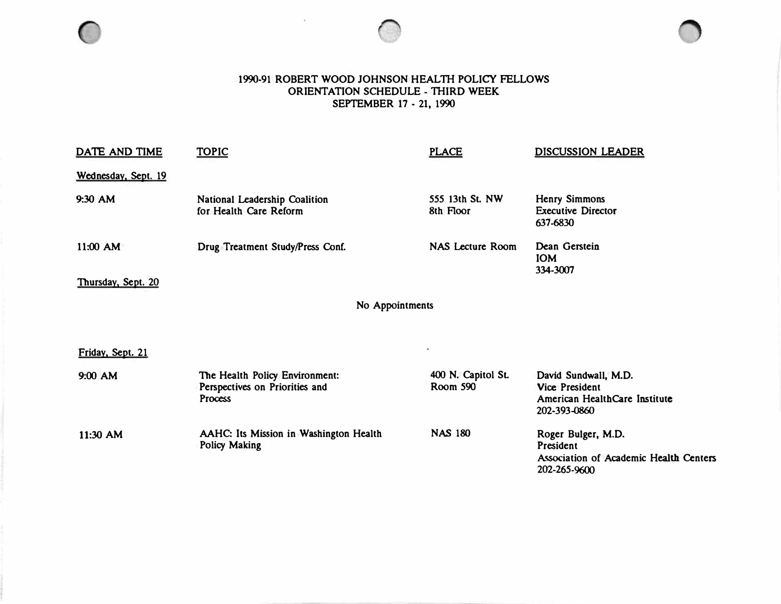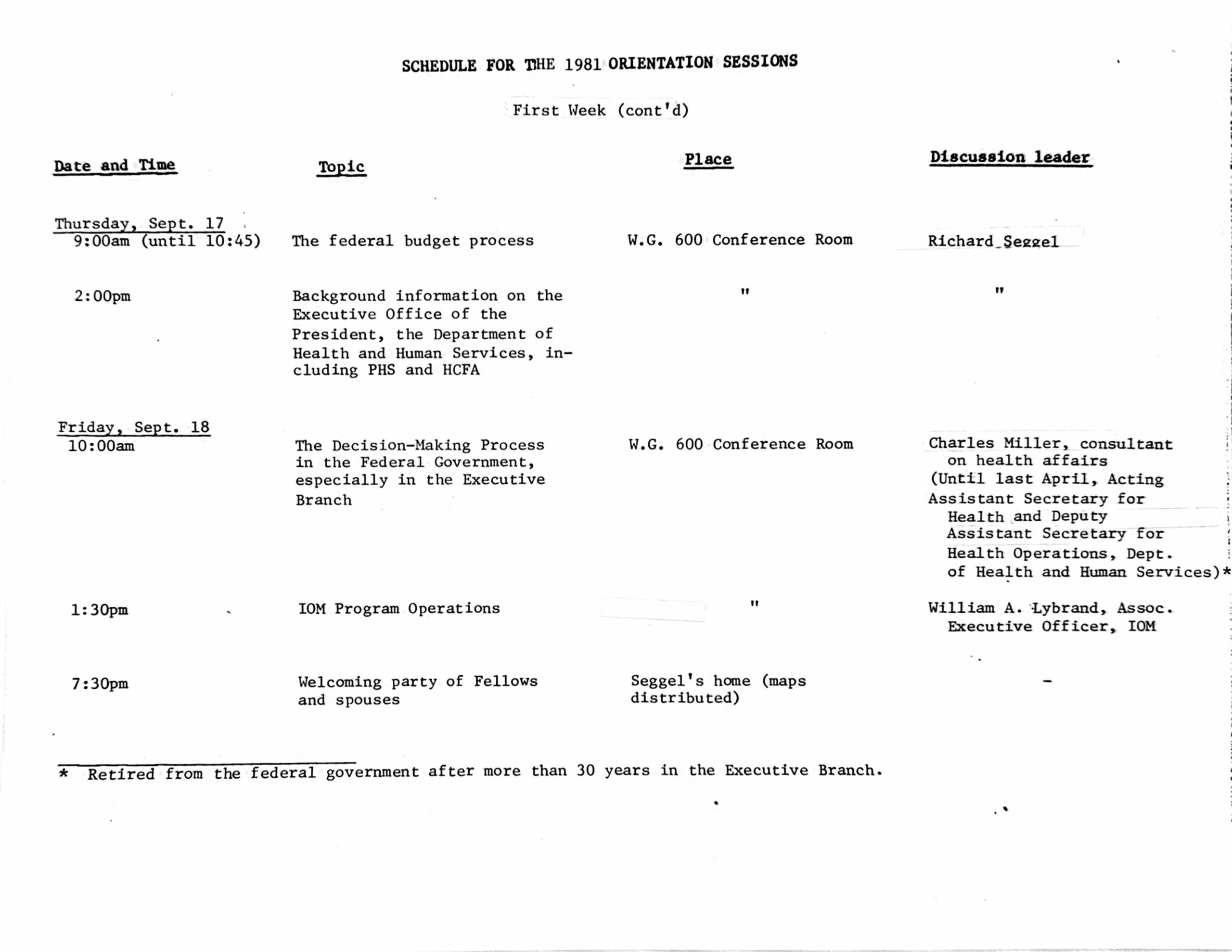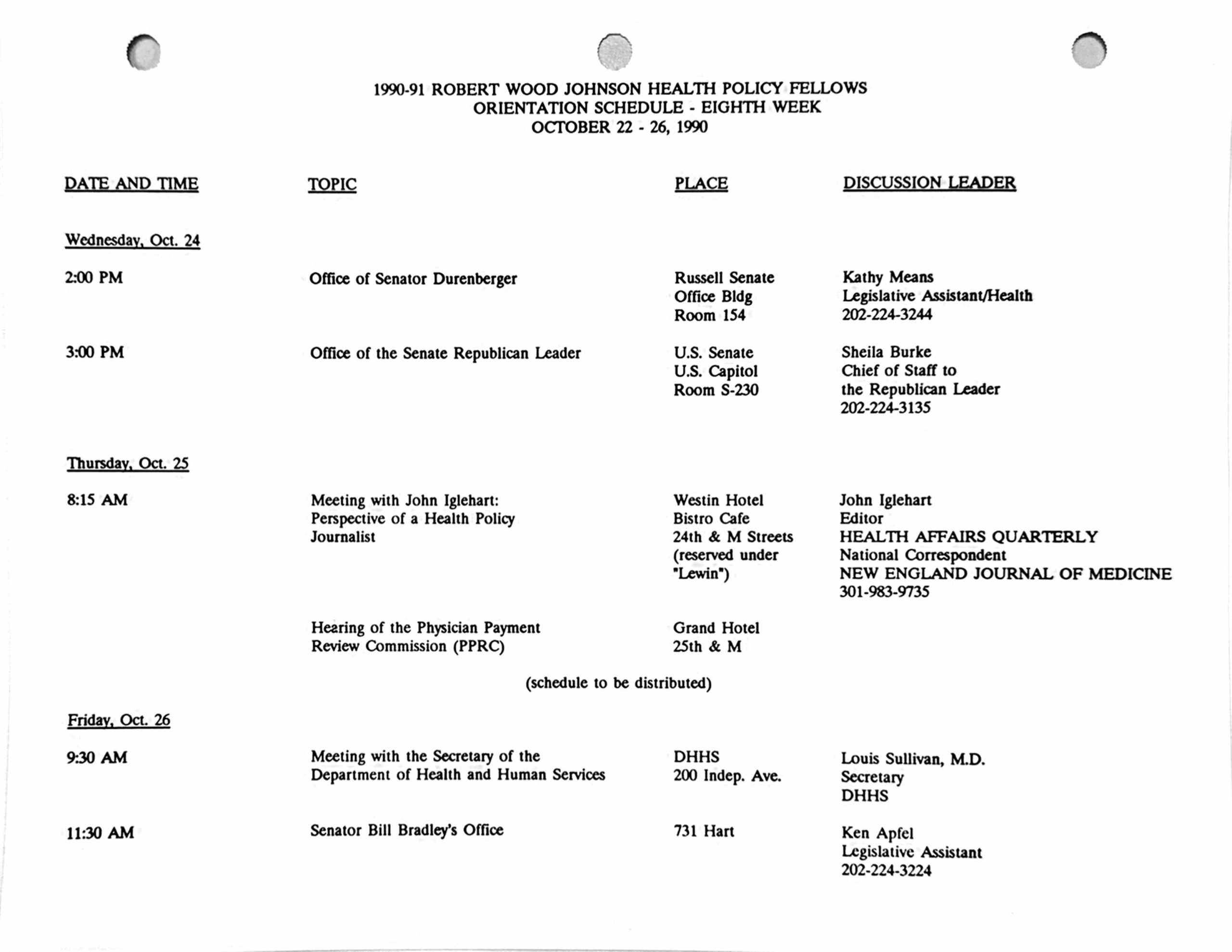 “Fellows would be expected to mọve to Washington, D.C. in time for the opening sessions, and to spend a period of six to eight weeks in an orientation program centered on matters of health and health policy organized by a staff based at the Institute of Medicine. This portion might include seminars to familiarize fellows with health agencies in government, congressional committees responsible for health affairs and the areas covered by each, problems and opportunities in health policy as viewed by the IOM staff and various IOM members, guest experts, HEW staff and congressional staff. Site visits to the various agencies might be scheduled. Insofar as it would be possible and consistent with the development of seminars, the preliminary program should be tailored to each fellow’s individual interests.