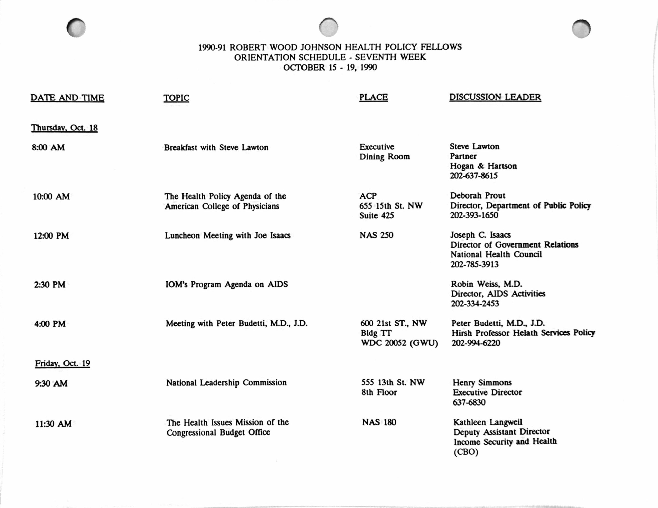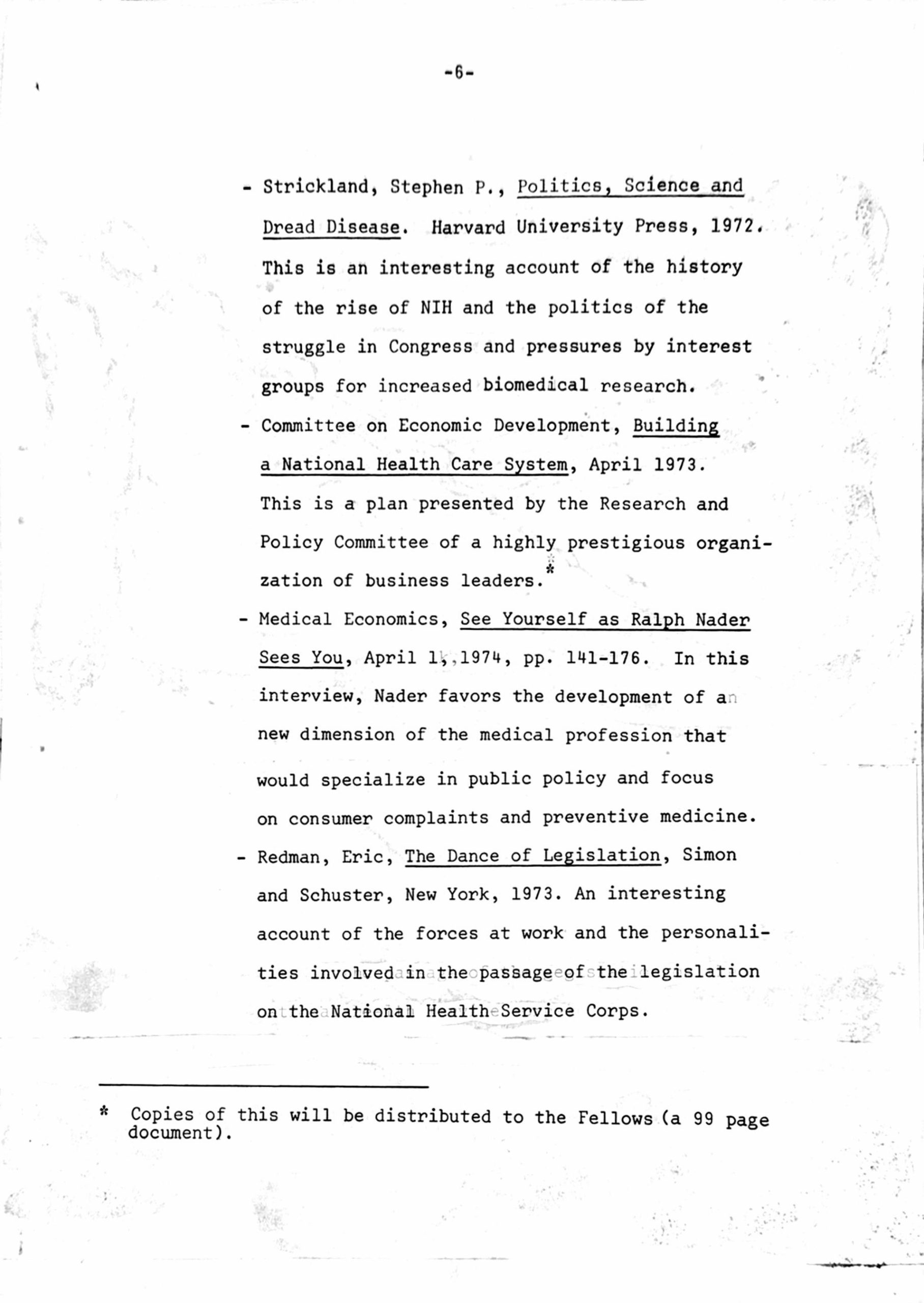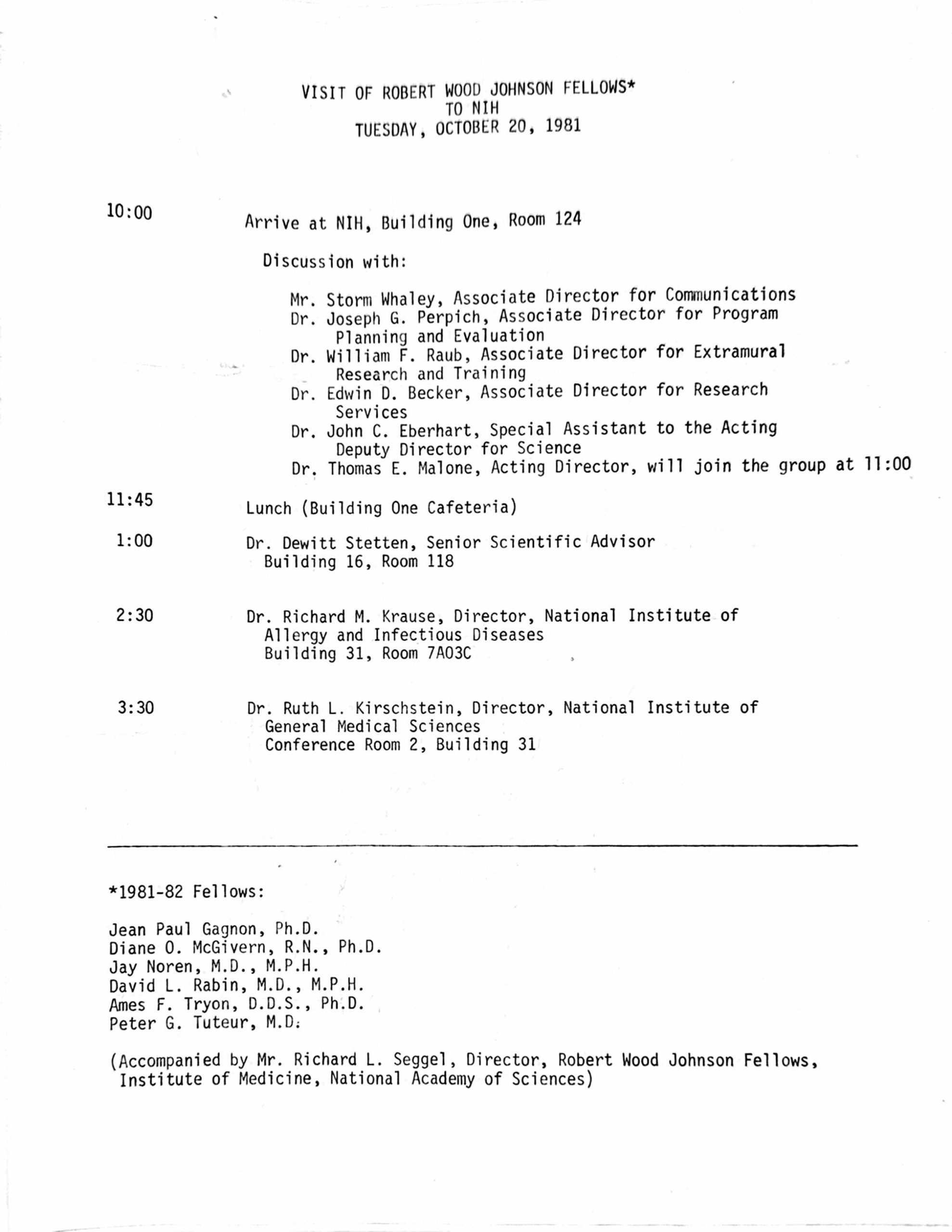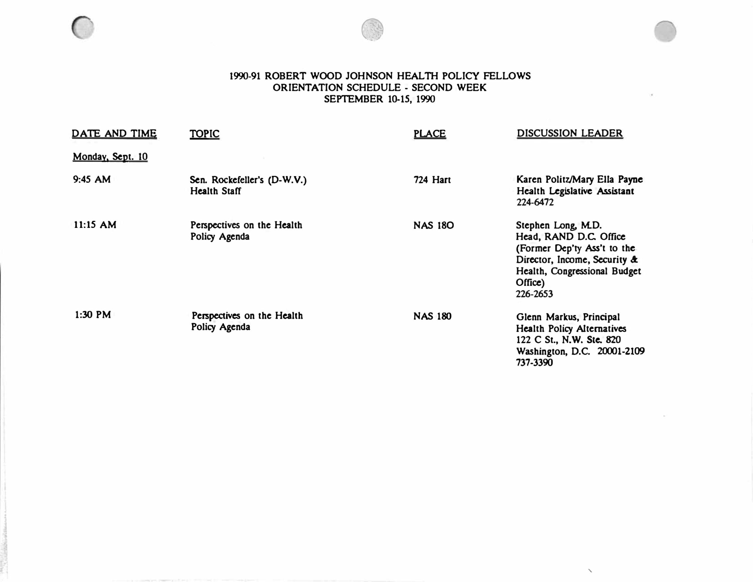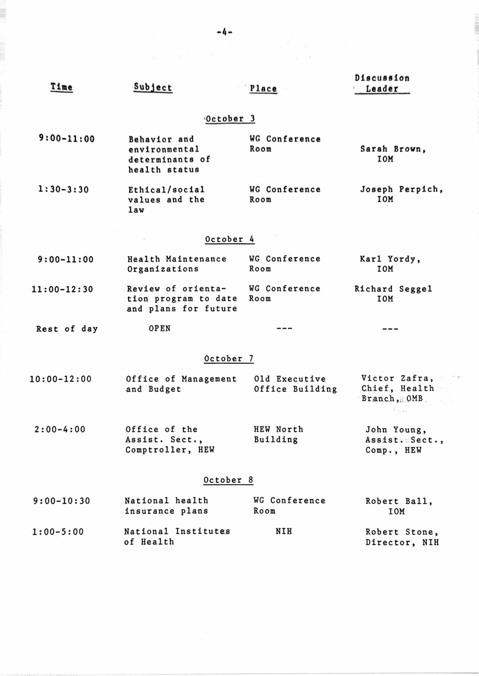 “Fellows would be expected to mọve to Washington, D.C. in time for the opening sessions, and to spend a period of six to eight weeks in an orientation program centered on matters of health and health policy organized by a staff based at the Institute of Medicine. This portion might include seminars to familiarize fellows with health agencies in government, congressional committees responsible for health affairs and the areas covered by each, problems and opportunities in health policy as viewed by the IOM staff and various IOM members, guest experts, HEW staff and congressional staff. Site visits to the various agencies might be scheduled. Insofar as it would be possible and consistent with the development of seminars, the preliminary program should be tailored to each fellow’s individual interests.