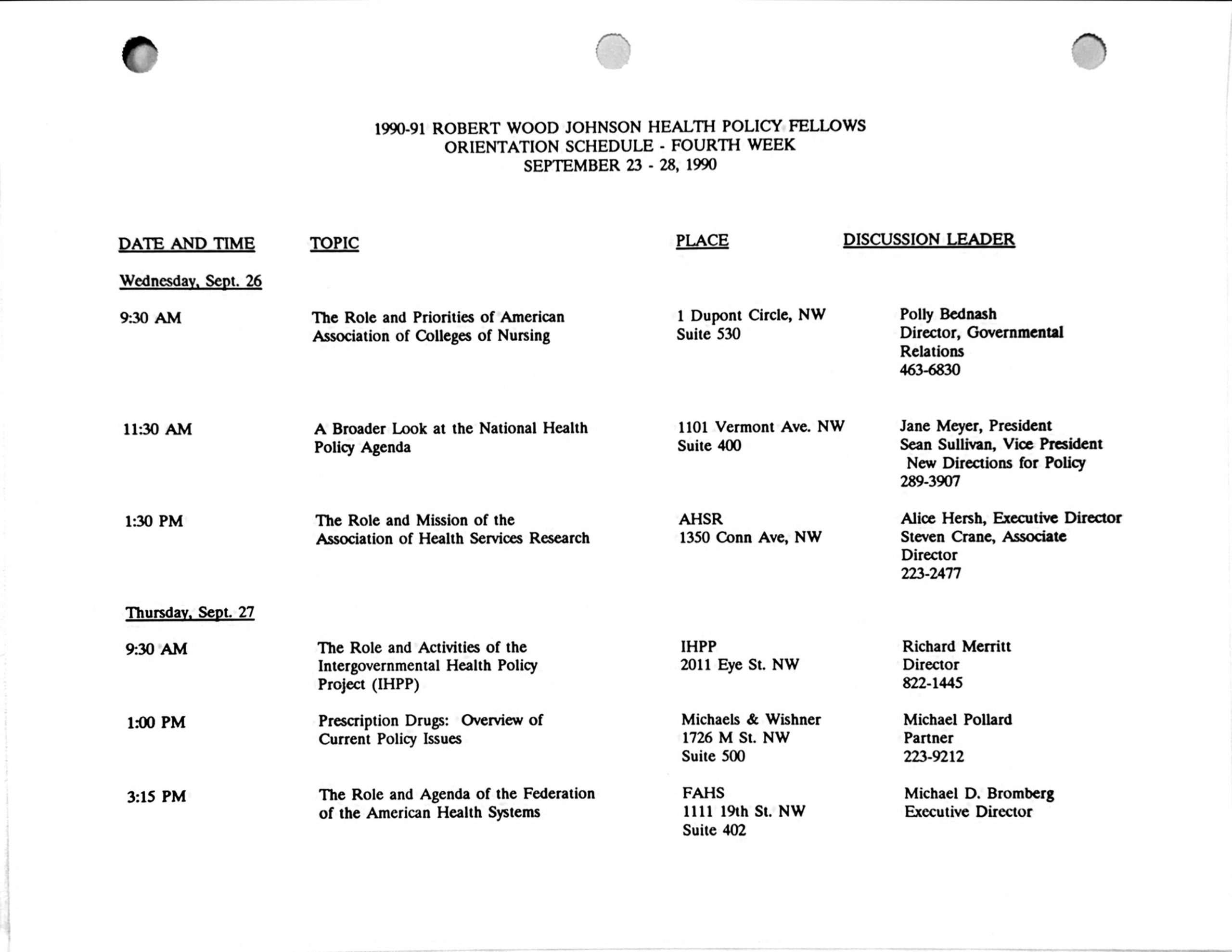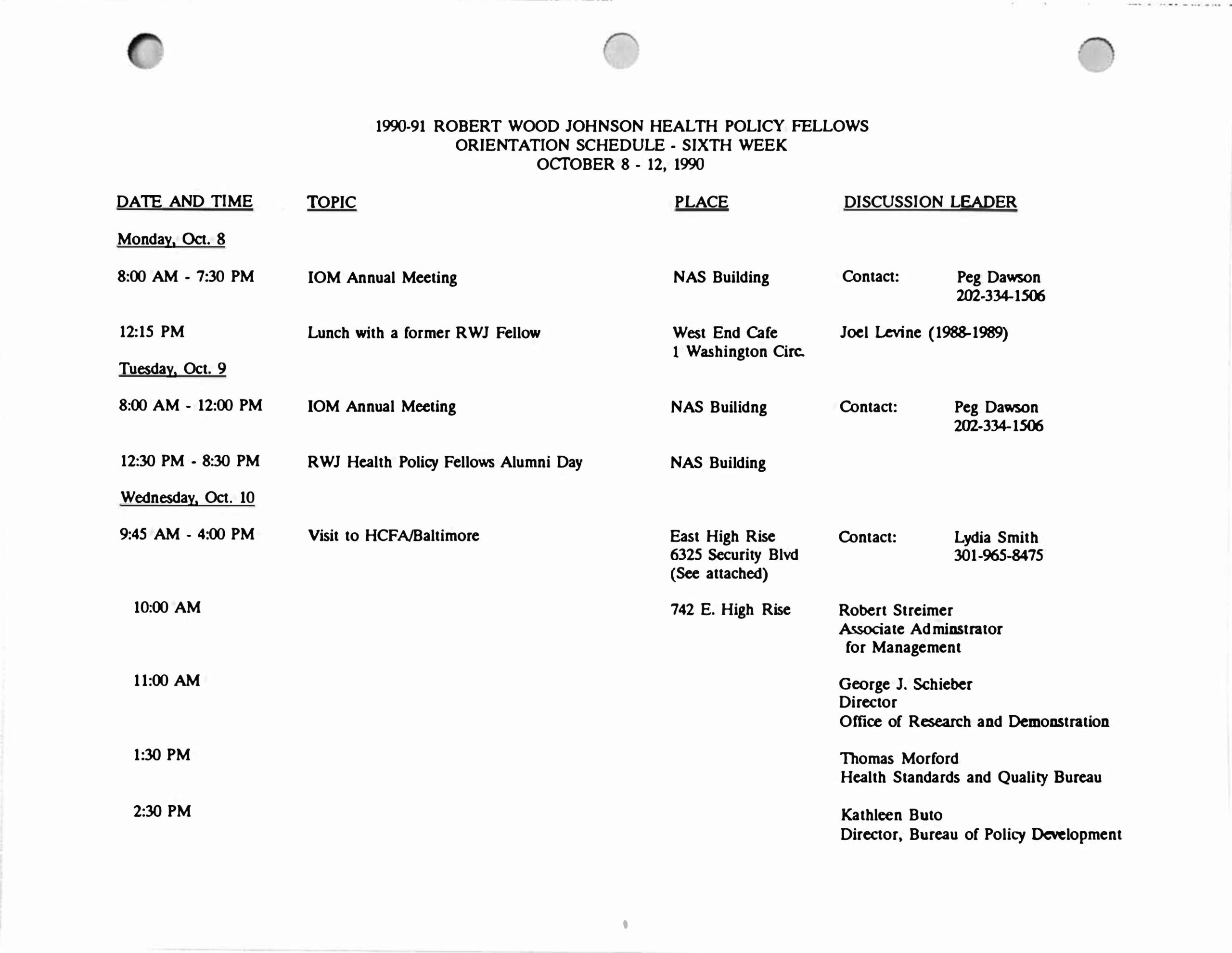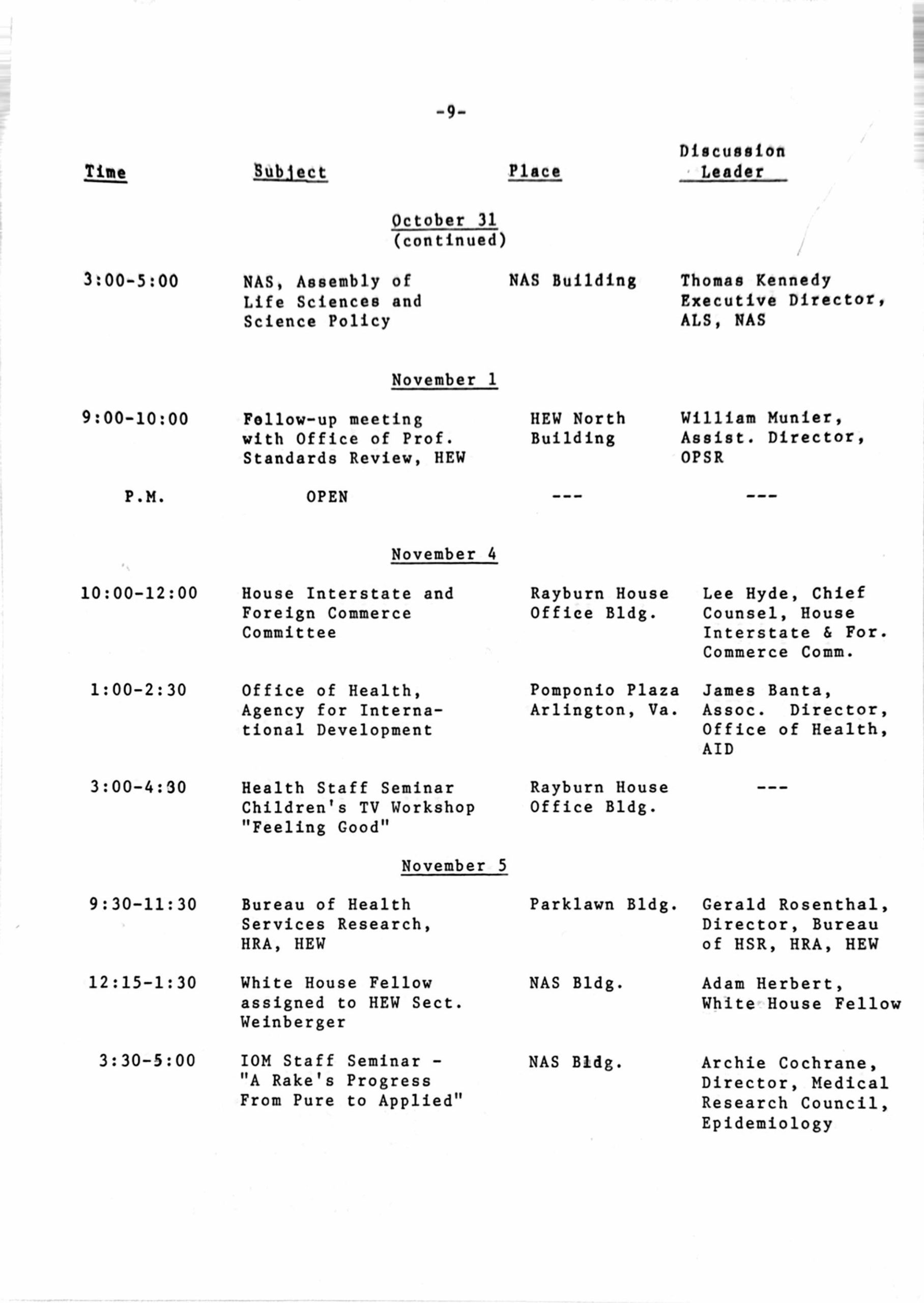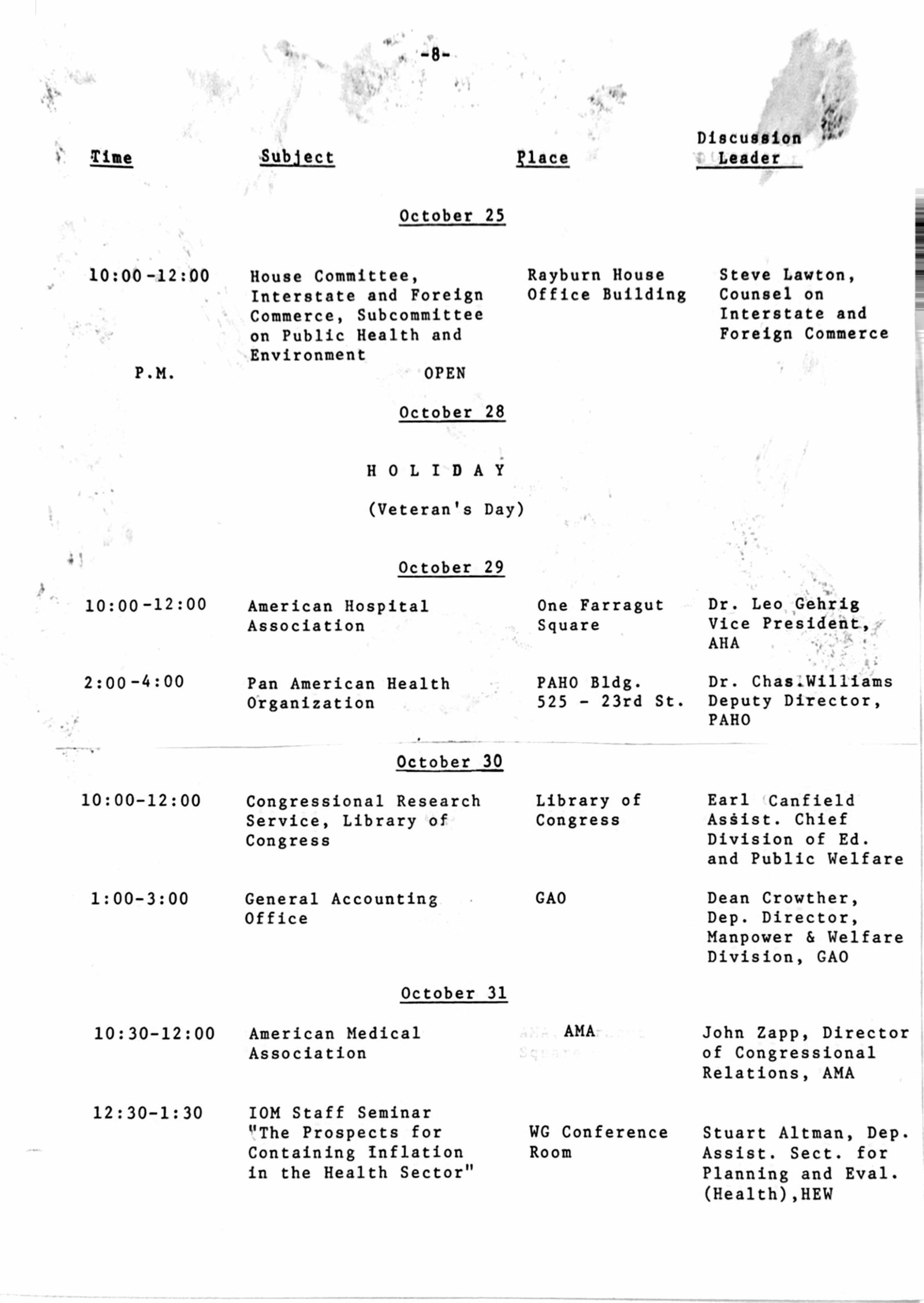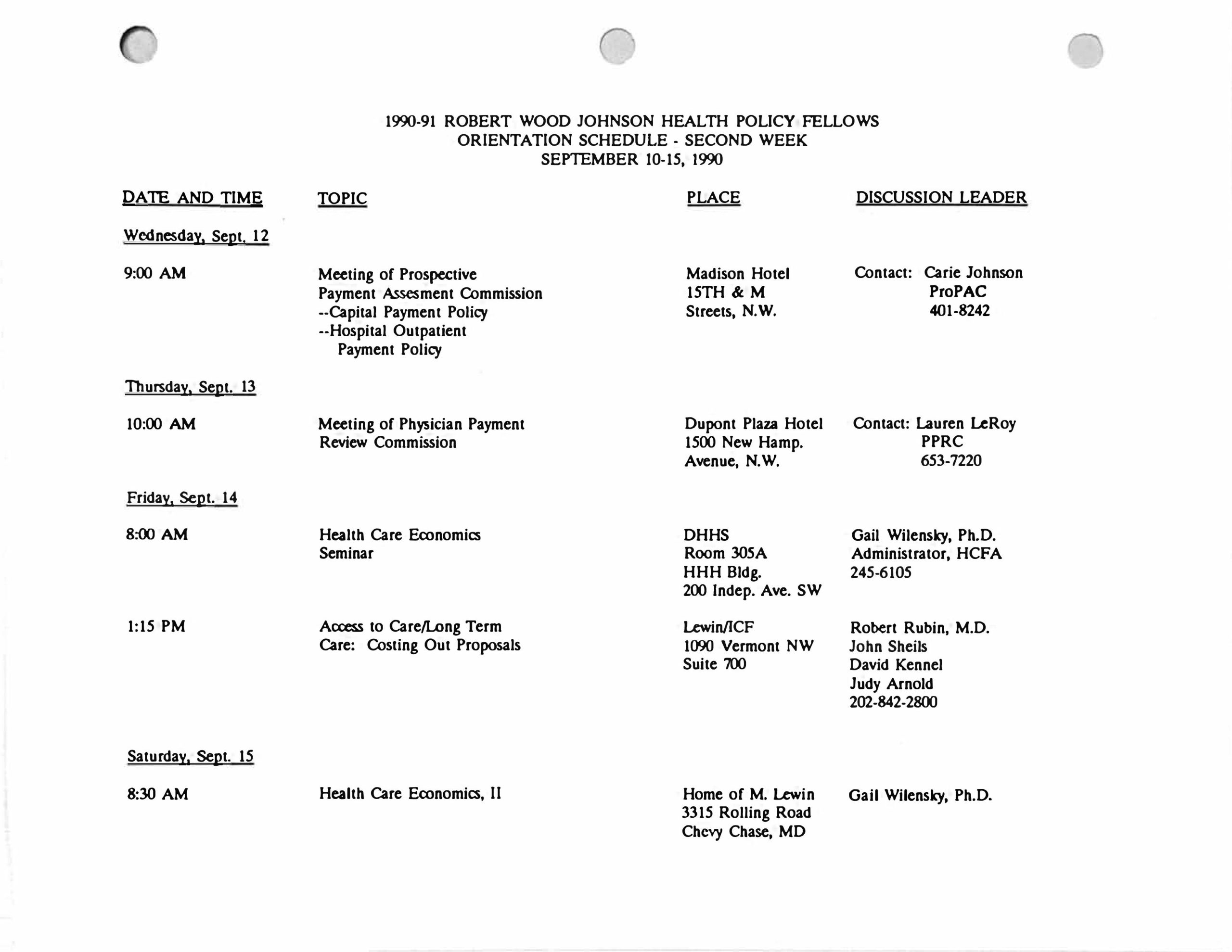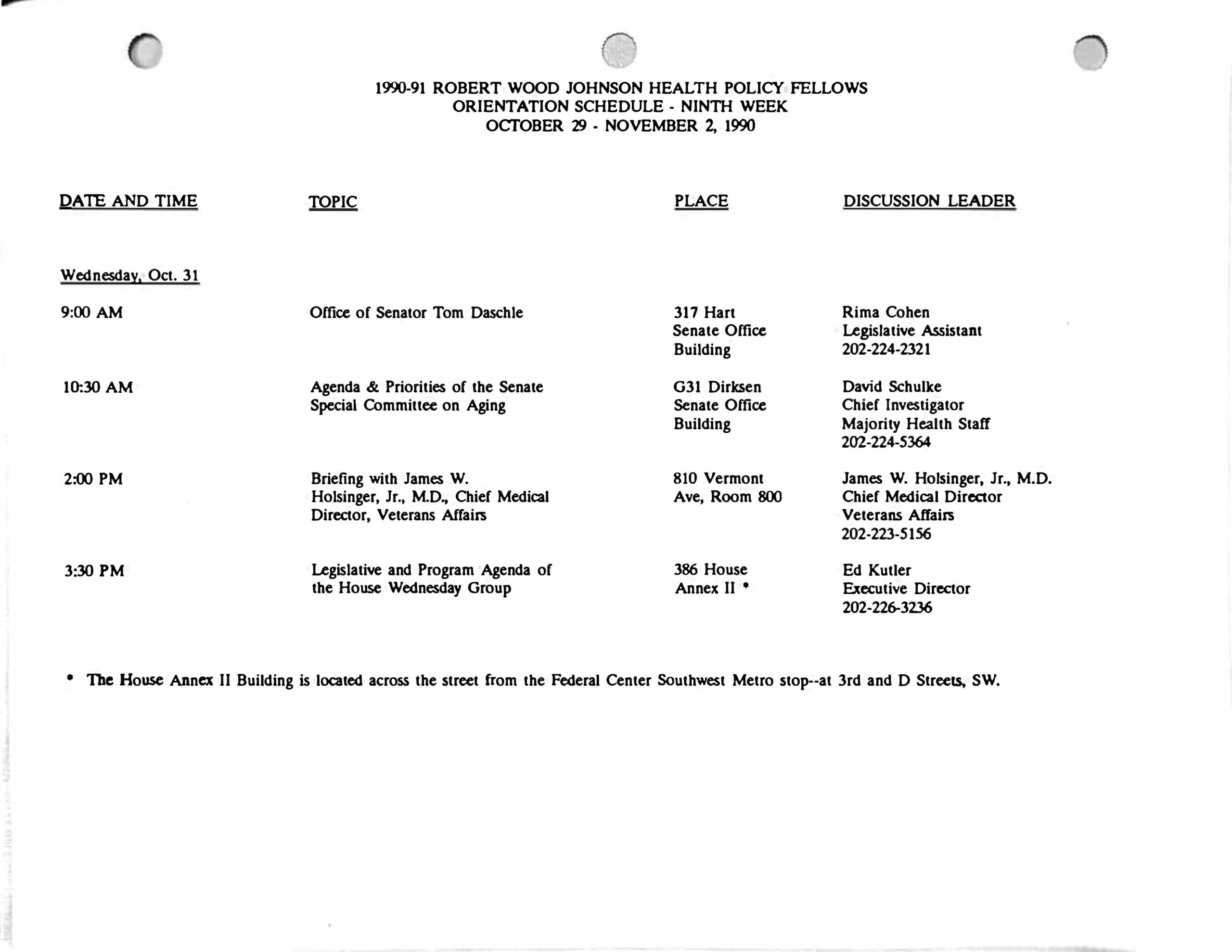 “Fellows would be expected to mọve to Washington, D.C. in time for the opening sessions, and to spend a period of six to eight weeks in an orientation program centered on matters of health and health policy organized by a staff based at the Institute of Medicine. This portion might include seminars to familiarize fellows with health agencies in government, congressional committees responsible for health affairs and the areas covered by each, problems and opportunities in health policy as viewed by the IOM staff and various IOM members, guest experts, HEW staff and congressional staff. Site visits to the various agencies might be scheduled. Insofar as it would be possible and consistent with the development of seminars, the preliminary program should be tailored to each fellow’s individual interests.