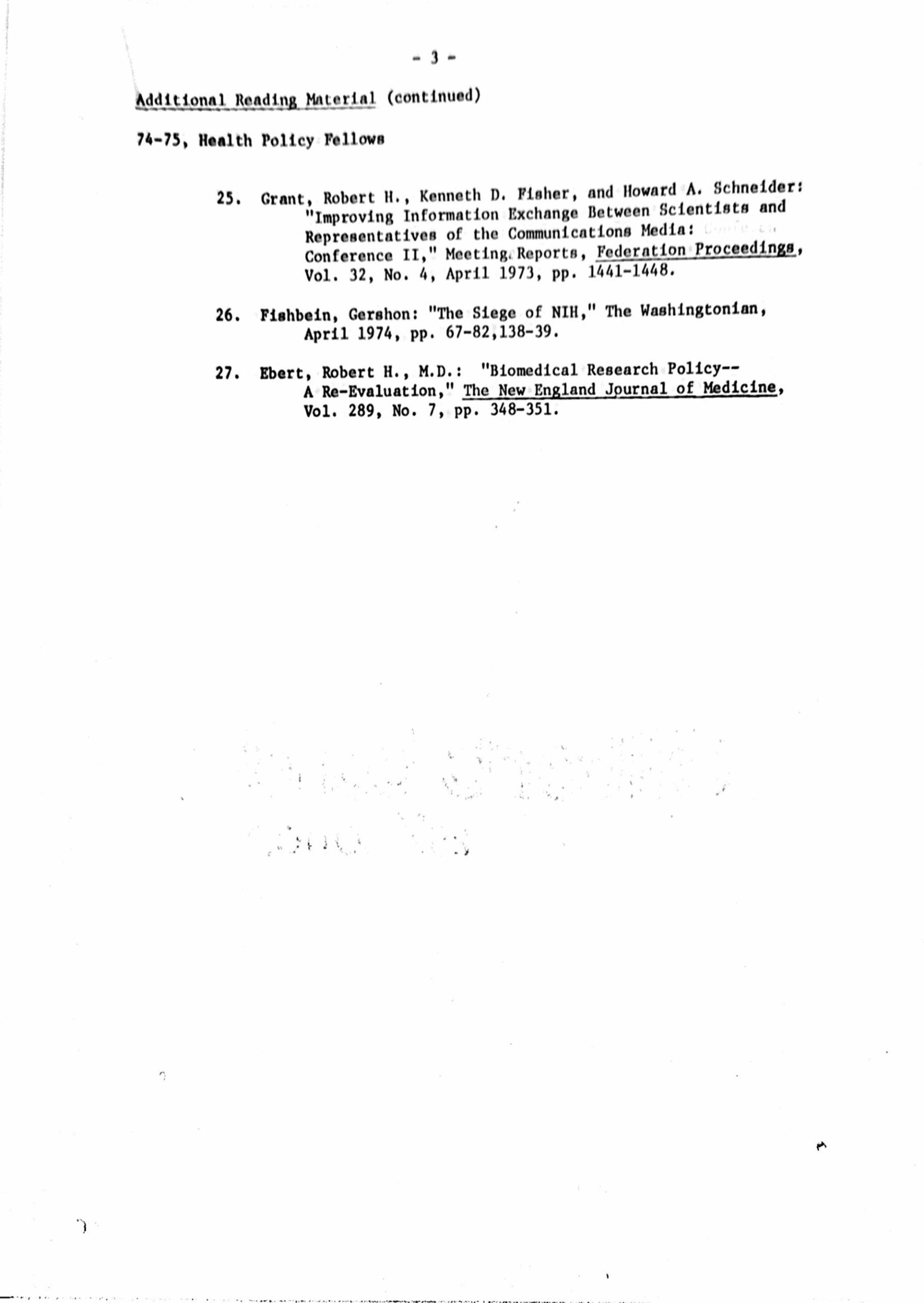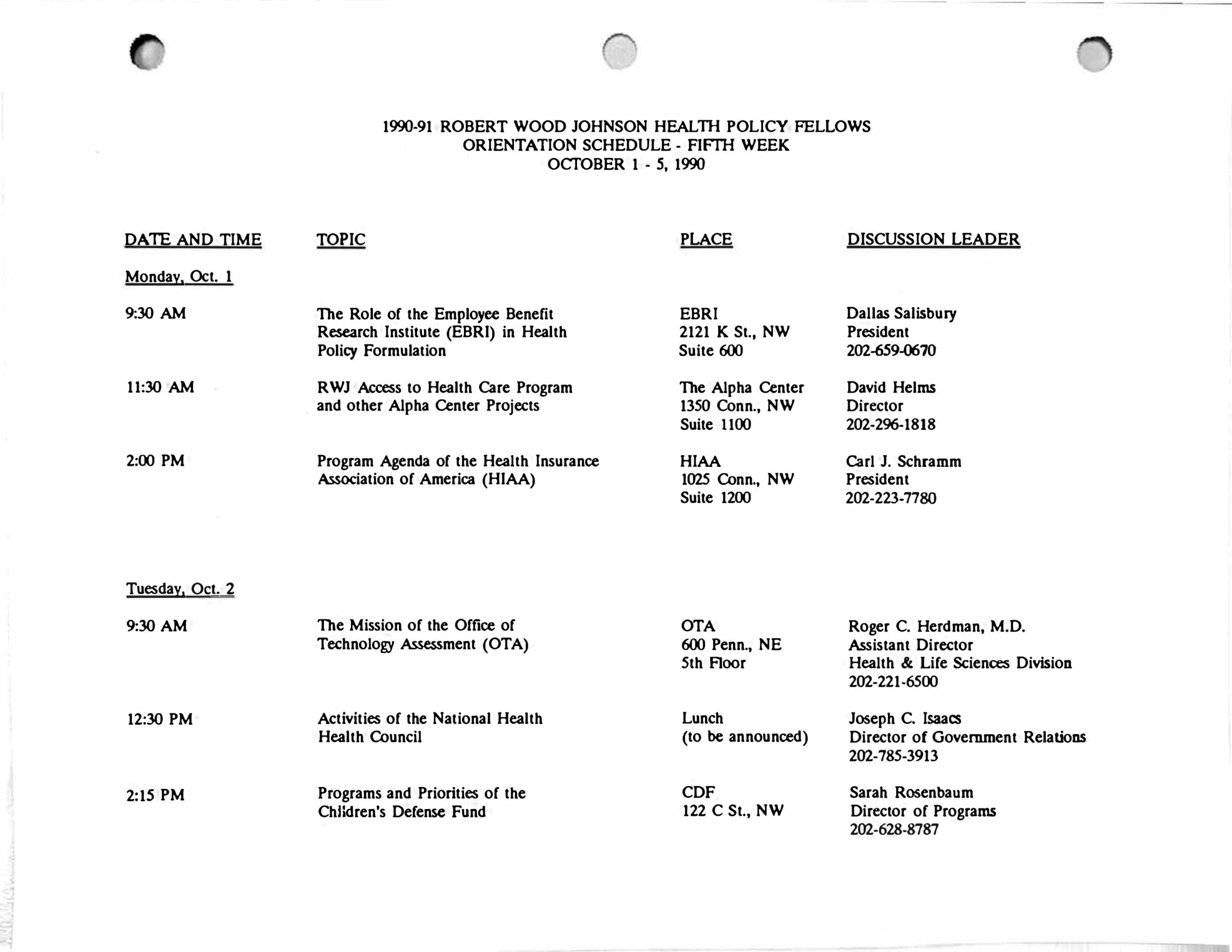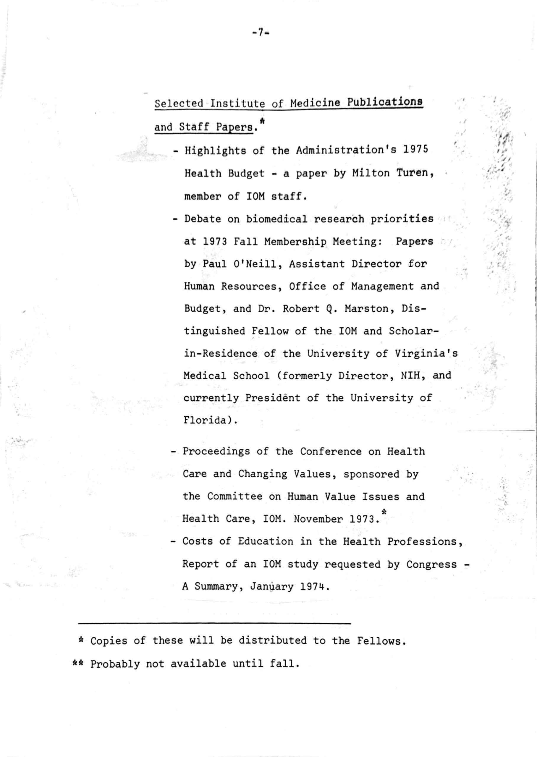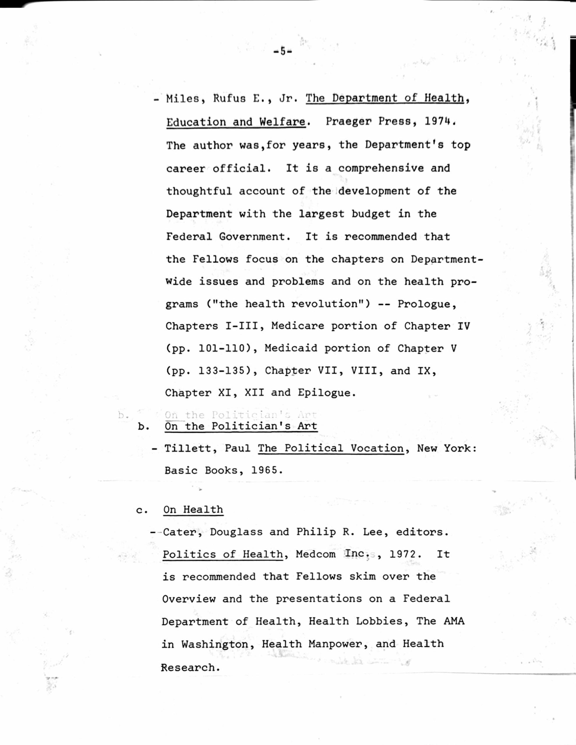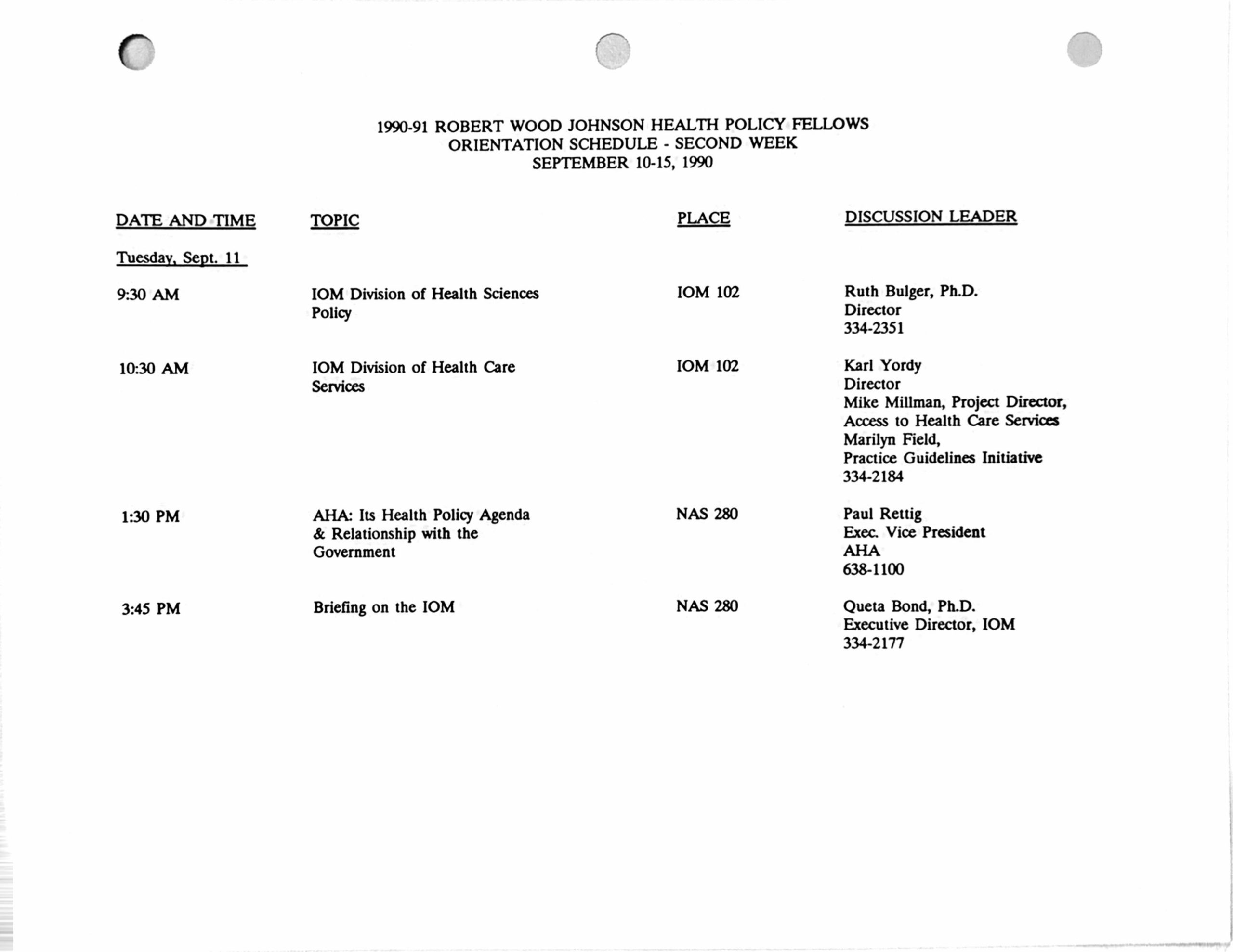 “Fellows would be expected to mọve to Washington, D.C. in time for the opening sessions, and to spend a period of six to eight weeks in an orientation program centered on matters of health and health policy organized by a staff based at the Institute of Medicine. This portion might include seminars to familiarize fellows with health agencies in government, congressional committees responsible for health affairs and the areas covered by each, problems and opportunities in health policy as viewed by the IOM staff and various IOM members, guest experts, HEW staff and congressional staff. Site visits to the various agencies might be scheduled. Insofar as it would be possible and consistent with the development of seminars, the preliminary program should be tailored to each fellow’s individual interests.