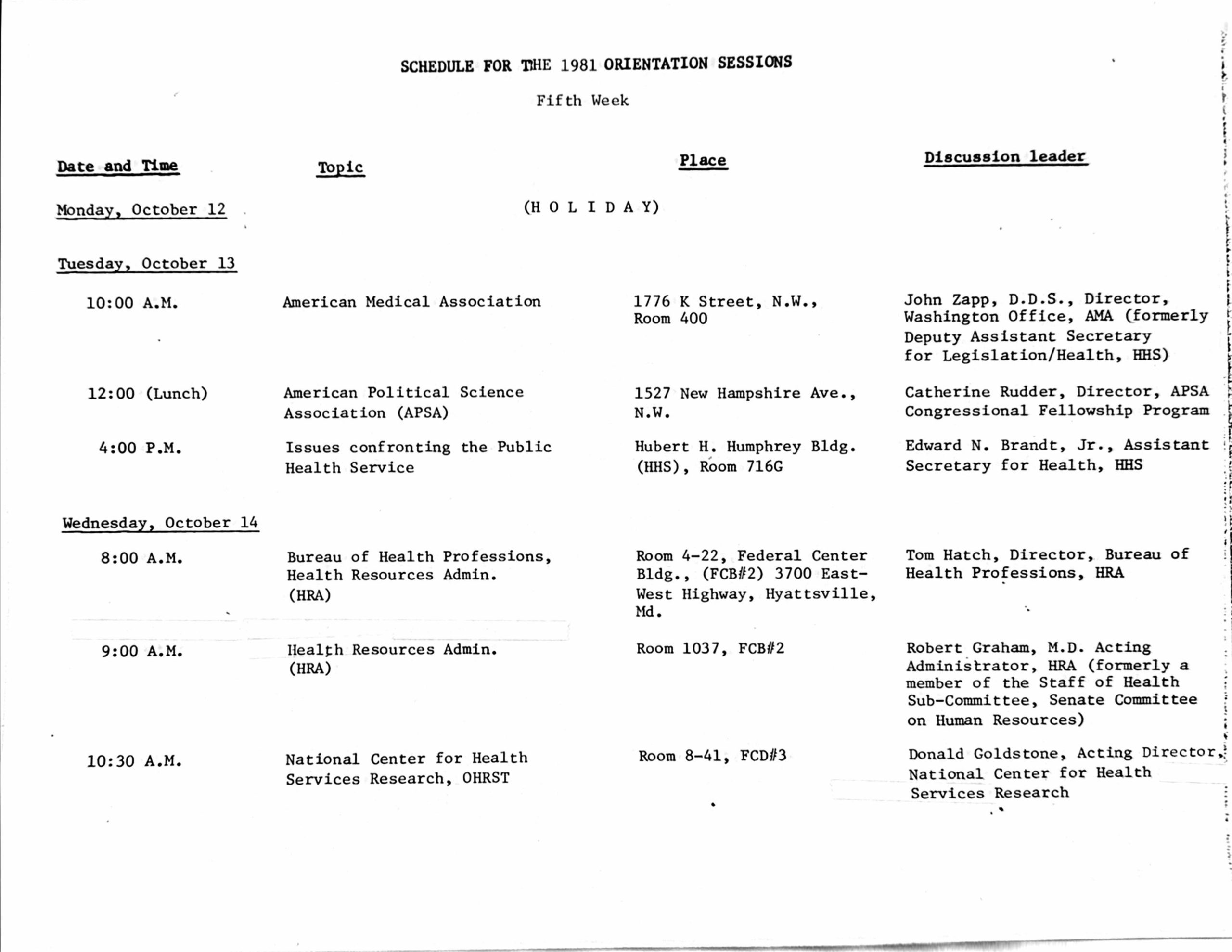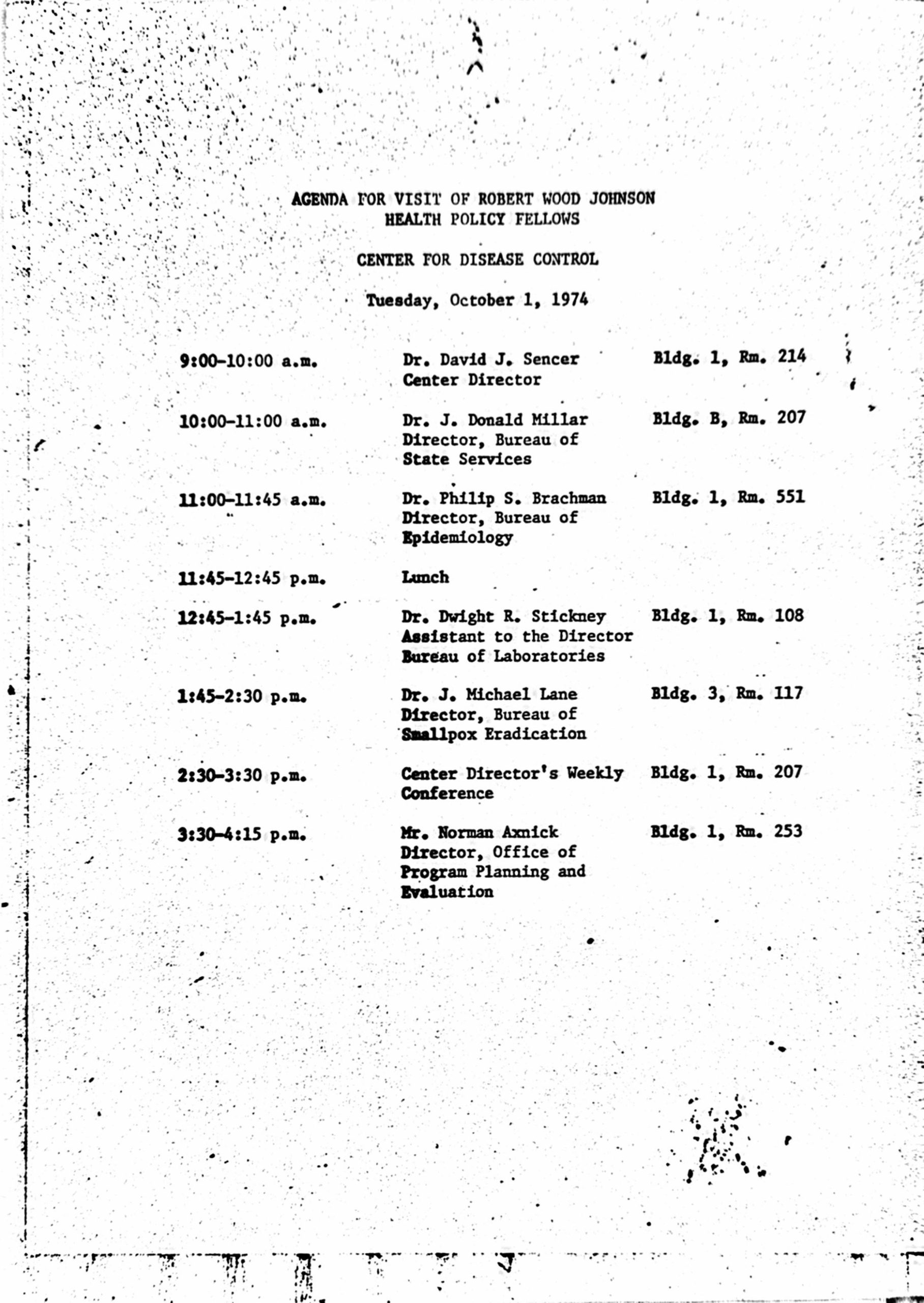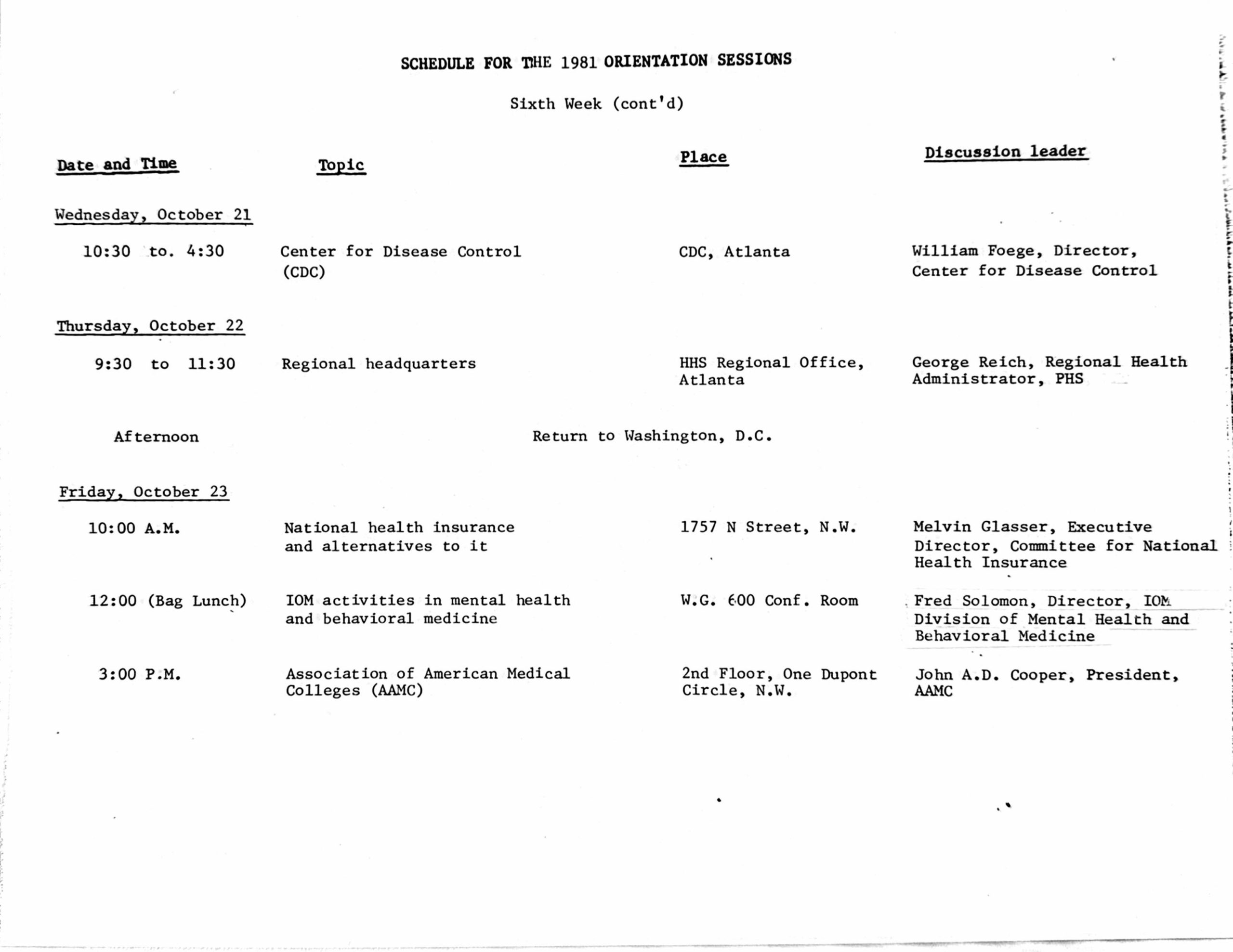 From the start of the fellowship, the orientation program included a field trip to Atlanta, Georgia to visit the Center for Disease Control (CDC) and a Department of Health, Education, and Welfare (HEW) (reorganized into the Department of Health and Human Services (HHS) in 1980) regional office.