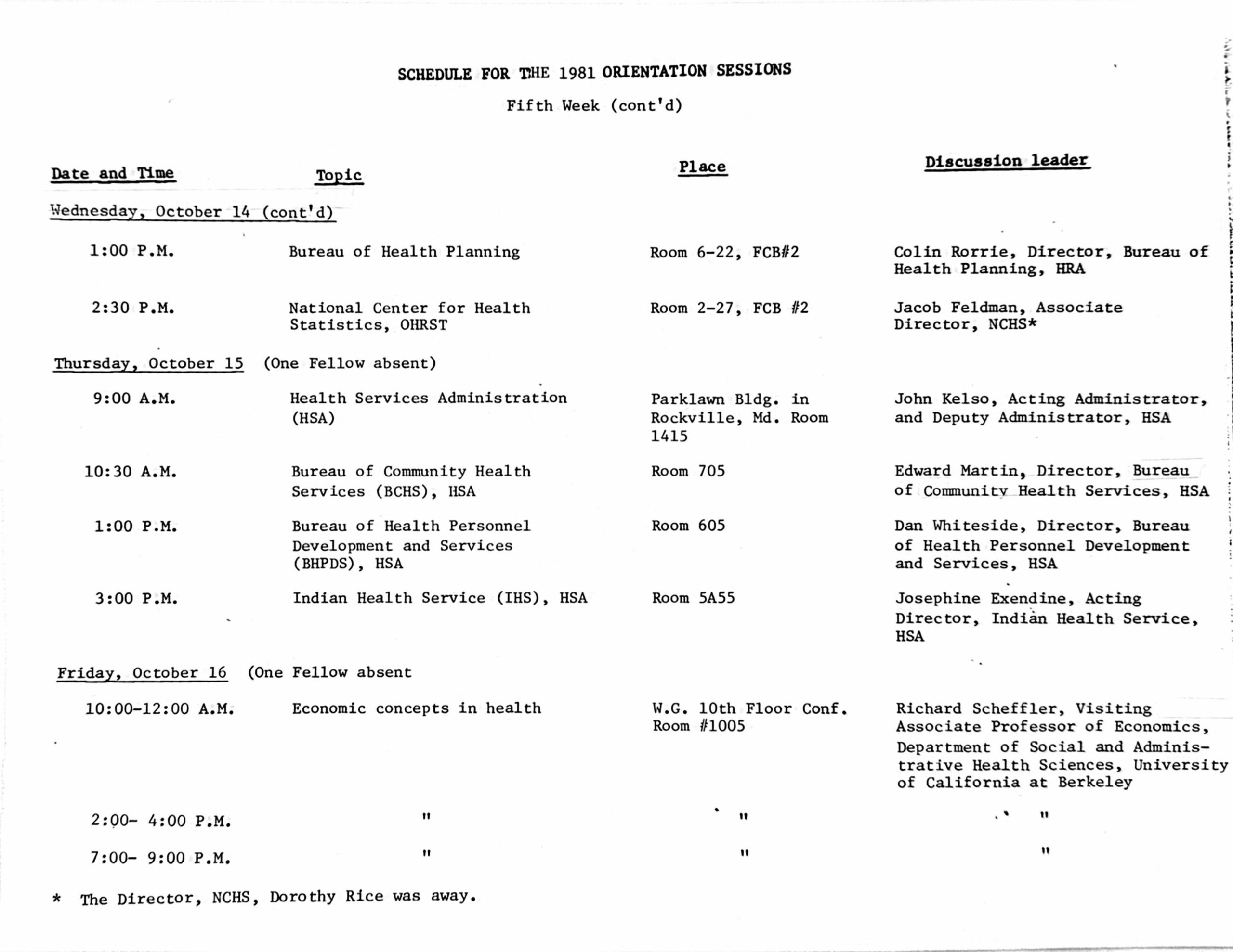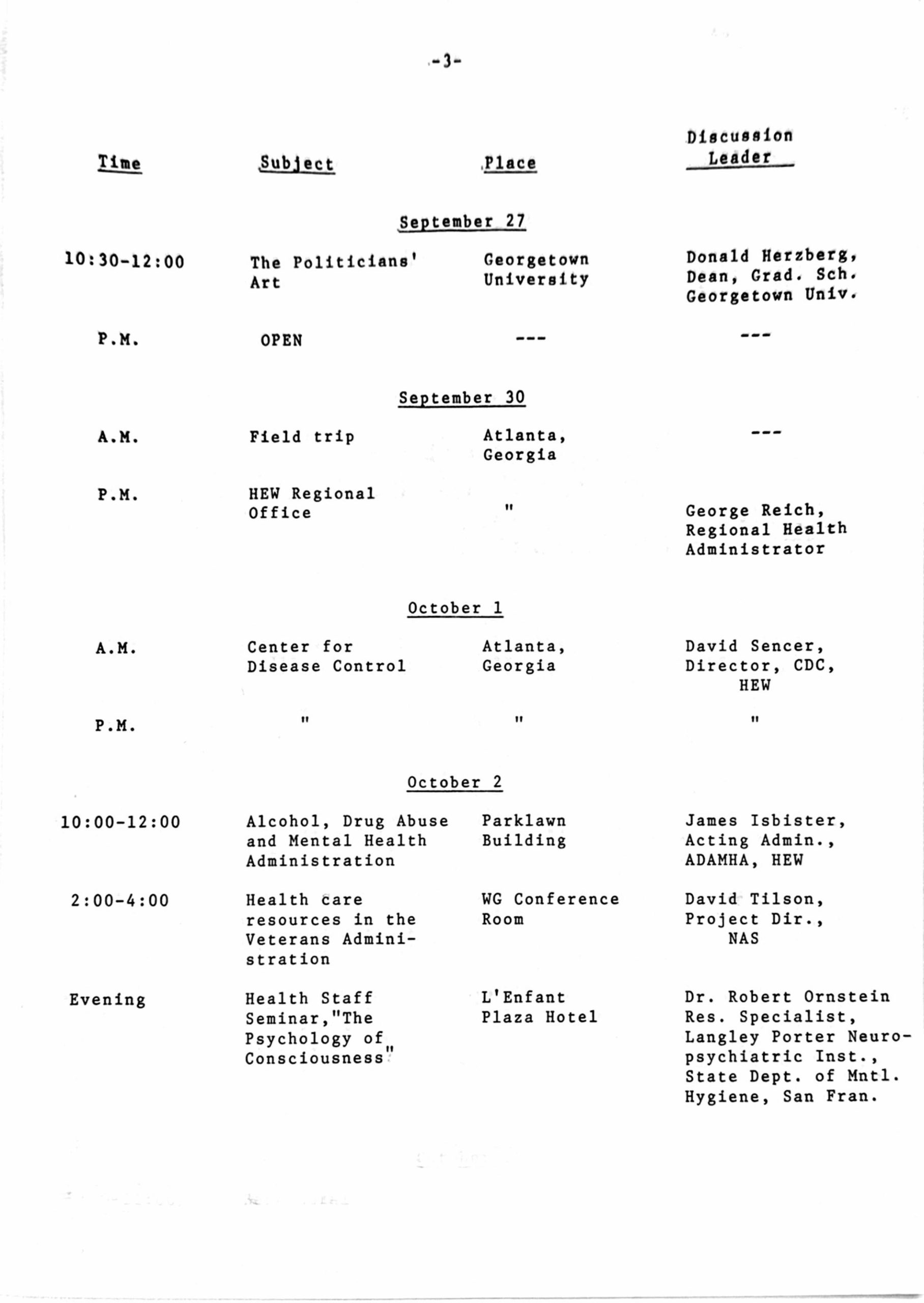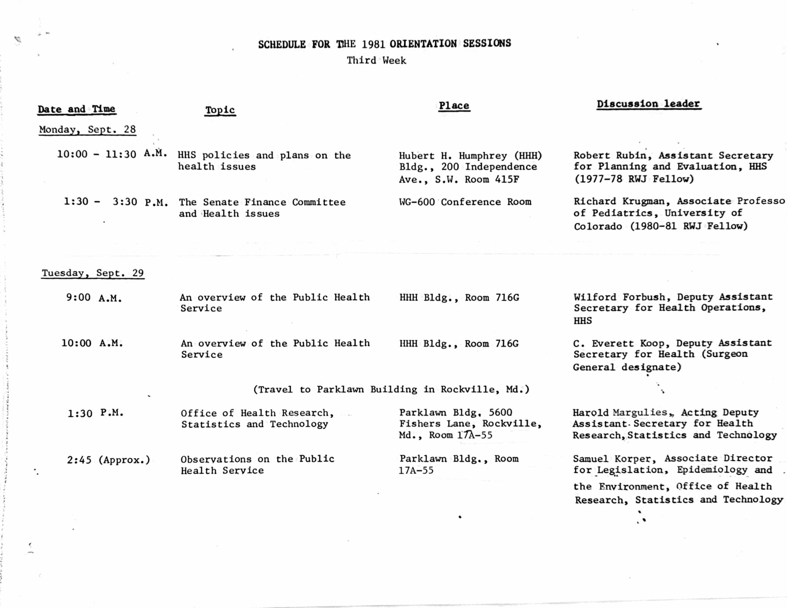 From the start of the fellowship, the orientation program included a field trip to Atlanta, Georgia to visit the Center for Disease Control (CDC) and a Department of Health, Education, and Welfare (HEW) (reorganized into the Department of Health and Human Services (HHS) in 1980) regional office.