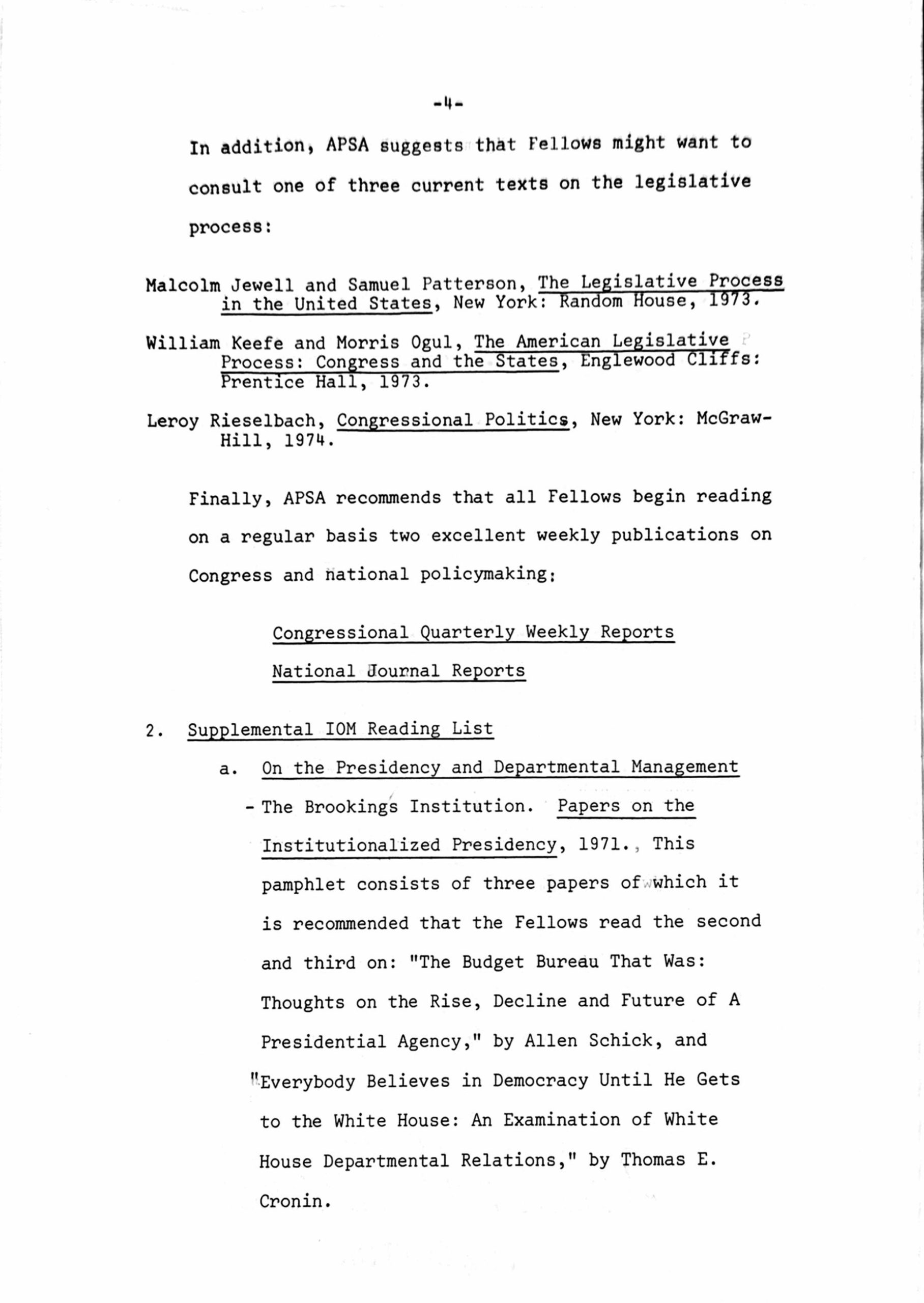 Following the IOM-sponsored period, the fellows would join the regular [American Political Science Association (APSA)] Congressional Fellows Program. They would be incorporated in the program along with fellows from the fields of political science and journalism. The Congressional Fellowship Program begins with a period of introduction to the Federal government and how it functions.”