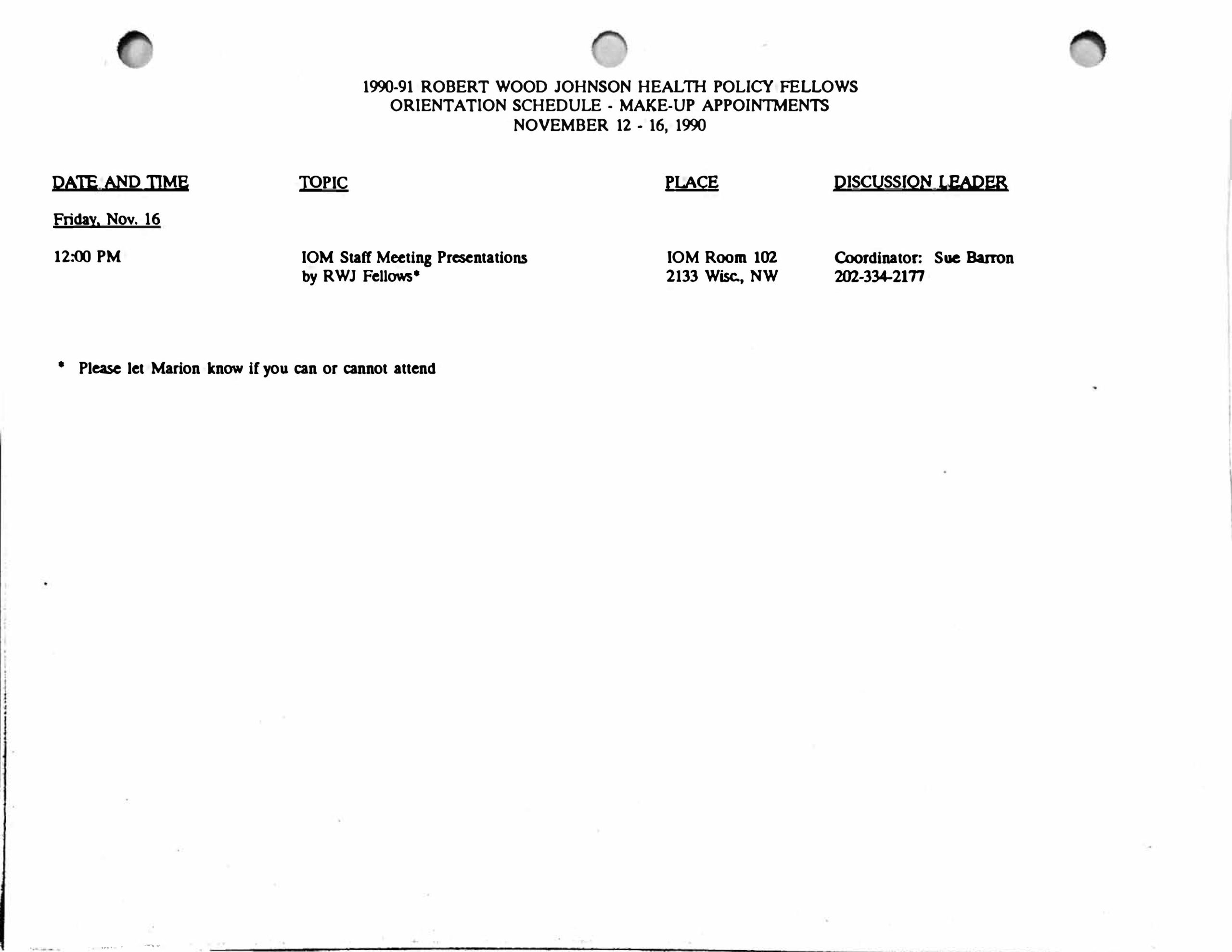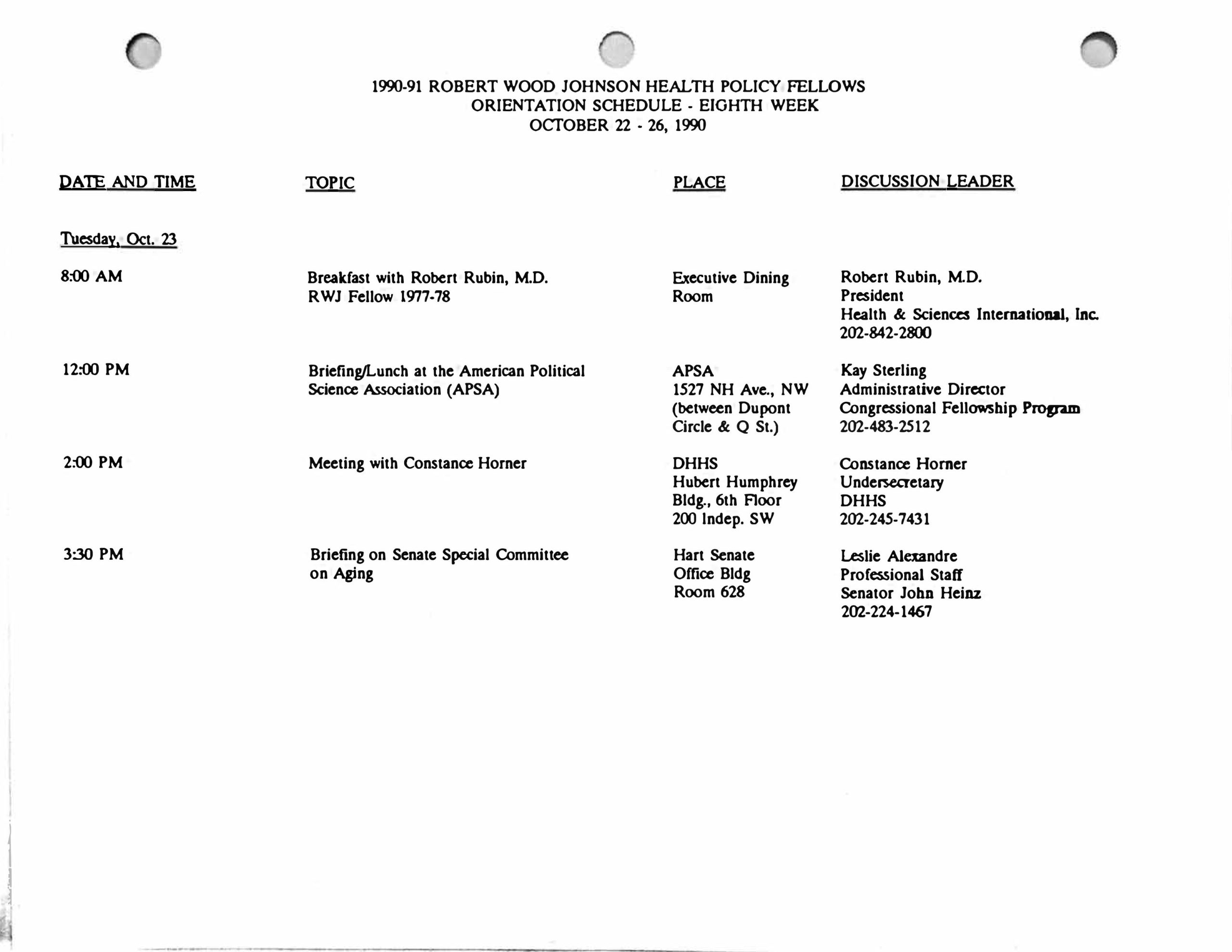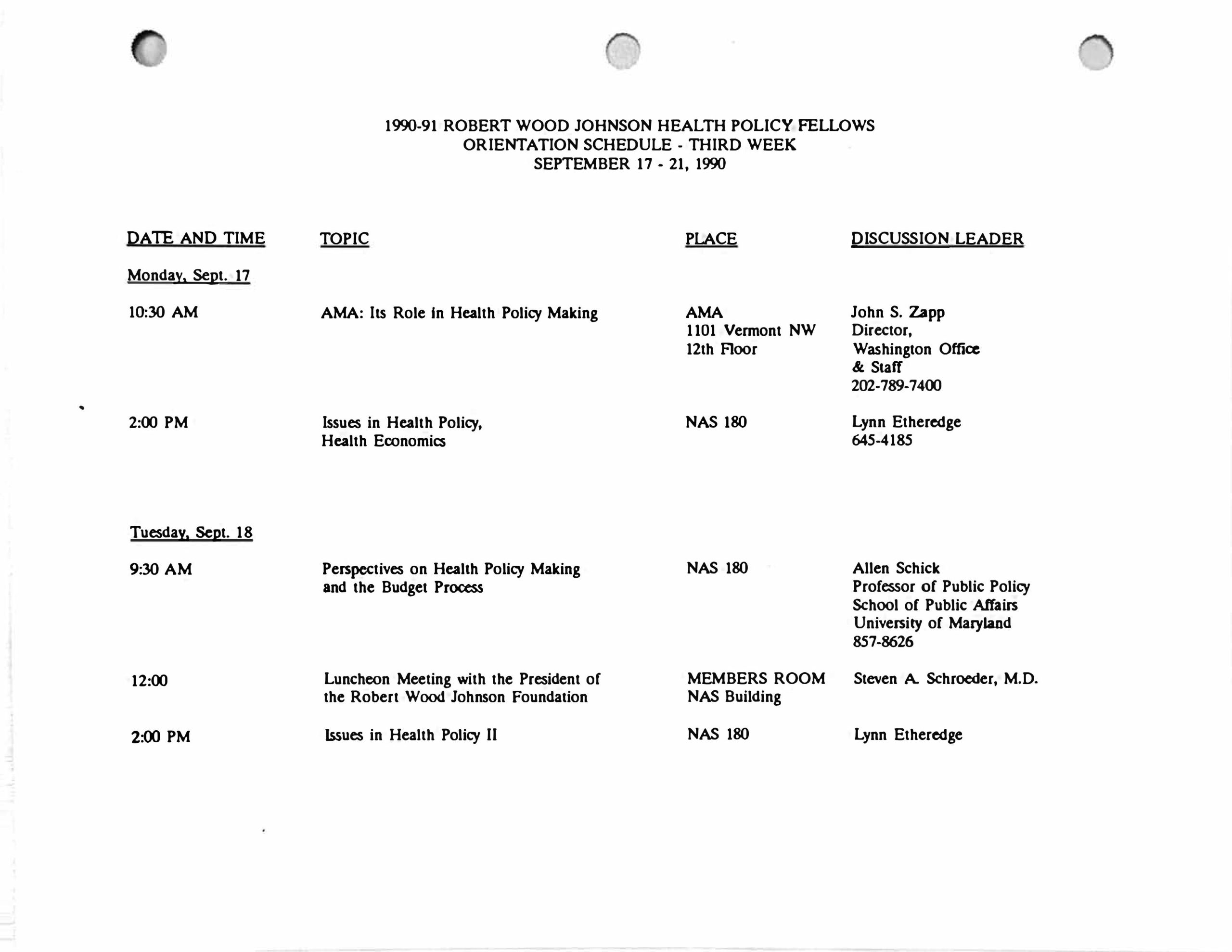 In 1985, the Board evaluated the orientation program to ensure it was meeting the needs of the fellows. After reviewing past fellows’ evaluation reports and discussing internally, the Board concluded that an 8-week orientation program was ideal and that it would neither shorten nor lengthen this portion of orientation, both of which had been recommended. The statement also stressed that “the basic purposes of the IOM orientation phase are to expose the Fellows as much as possible to all aspects of the decision-making process for developing and implementing public policy and to acquaint them with the full range of health policy issues which are under consideration. Since Fellows are generally expected to take work assignments in Congress for nine months of the Fellowship year and the APSA orientation focuses heavily on Congress, the IOM orientation necessarily places major emphasis on the Executive Branch.”