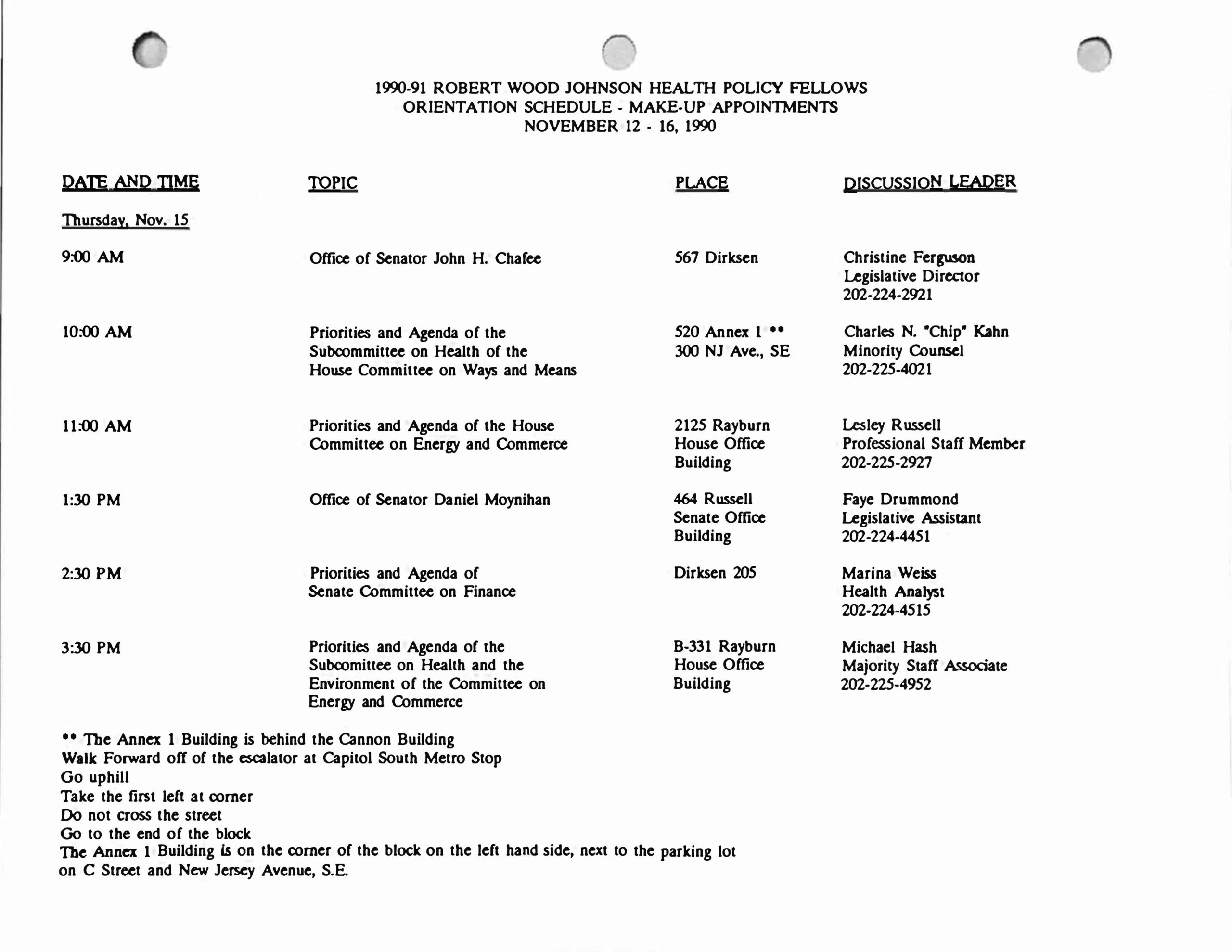 Today, orientation includes over 200 meetings with national leaders in health policy, think tanks and interest groups, key executive branch officials, and members of Congress and their staffs. The immersive orientation process covers health economics, the congressional budget process, priority health policy topics, and federal decision-making. The fellows also participate in activities, including executive coaching and media training sessions to help prepare them for their placements and future work in health policy. The briefers and schedule change every year in response to the changing health policy landscape and recommendations from the previous fellowship cohort.