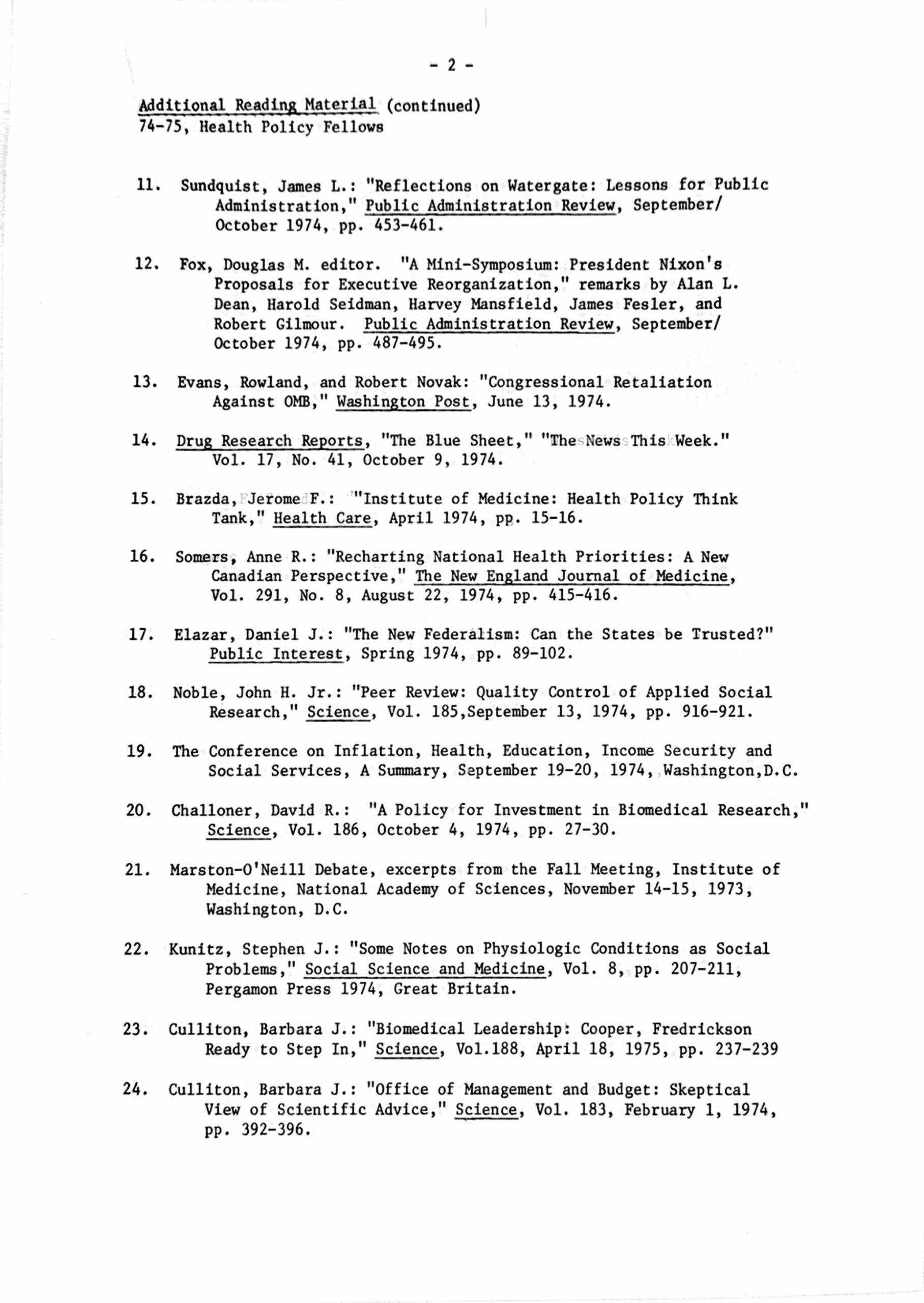The original July 1972 proposal stated, “Fellows will enjoy a planned group educational experience which should systematically explore the interrelationships among the various arms of the Health Enterprise (or Industry) and all those governmental and non-governmental agencies and organizations which significantly influence public policy. It is likely that much can be learned in this area from the experience of the White House Fellows program which has been in existence for more than 5 years.”