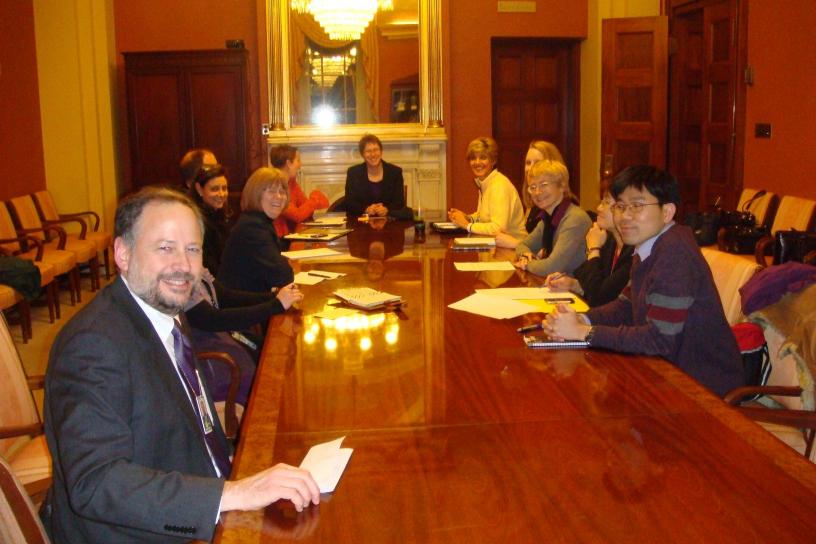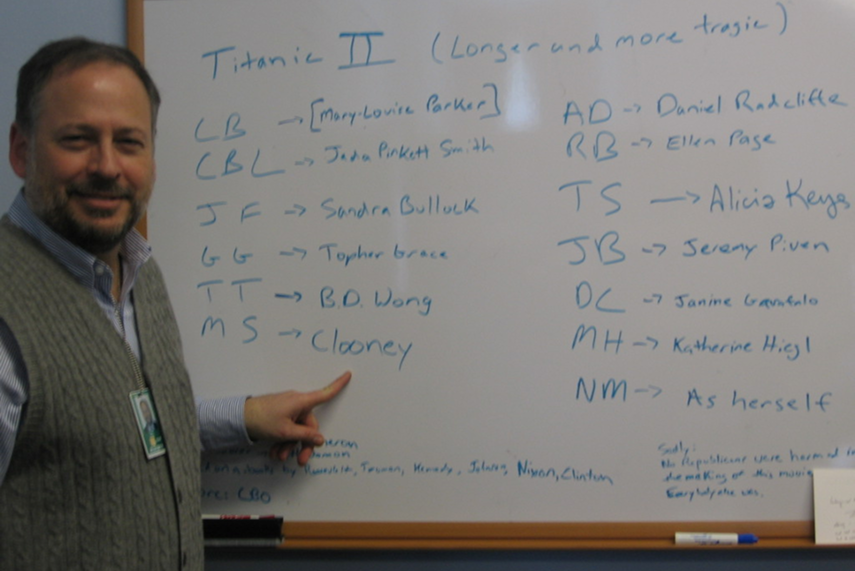 When the passage of the Affordable Care Act looked unlikely in early 2010, the Senate Ways and Means committee took a break from brainstorming how to get the bill through the Senate and pitched a movie based on their perceived failure. They named their fictional film Titanic II (Longer and more tragic), and chose celebrity actors to play each of them. In this photograph, 2009-10 fellow Mark Schwartz points to who would play him in the fictional film.